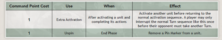 I love that there are standard Command Point uses here just like in Vanguard. Paying one Command Point to activate another unit and attempt to do your mini-alpha strike is a cool mechanic that breaks up the alternating activation akin to the Snap To order in Bolt Action.