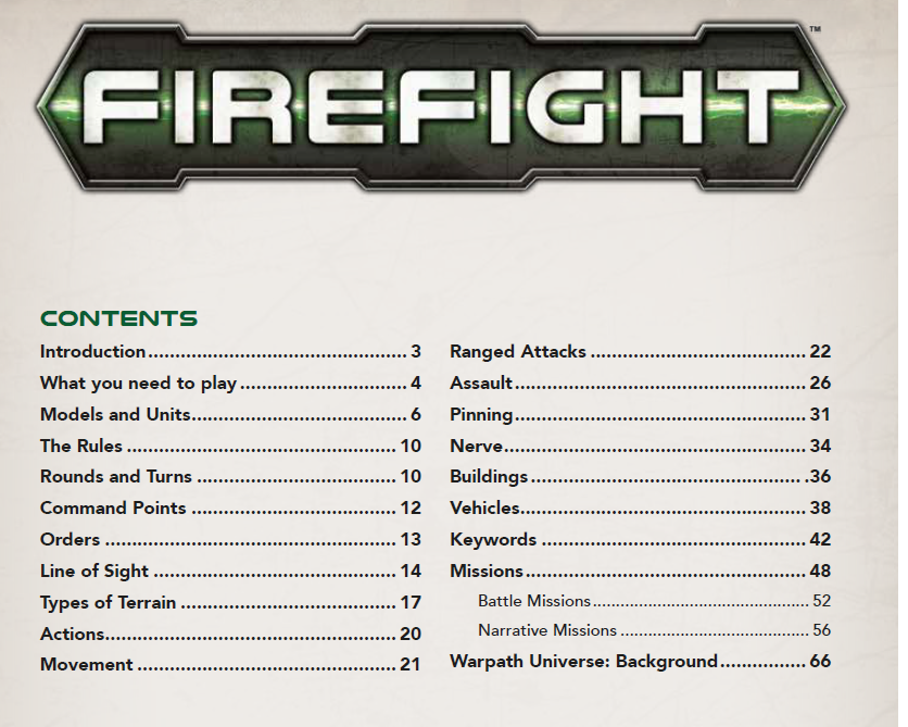 The rules themselves are 38 pages long with the missions following for almost 20 pages. I appreciate the easy to read contents here. One of the first things I looked for was an Index, and there isn't one included here - but the rules are relatively concise and well titled on the Contents page.