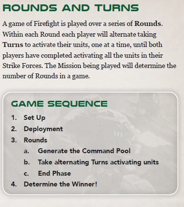 A game of Firefight is played in Rounds, with each player taking a Turn to activate a unit. I love alternating activation games and I'm so happy to see Mantic embrace it in Firefight. Whoever finishes activating their units first will go first in the next Round. There is also an endgame cleanup phase where you remove pins if possible, check nerve, score, etc. To give you an idea of the number of activations you might have in a game, the base box comes with ~775 points of models (a normal game is considered to be 1,000 points) and there are seven activations for each side.