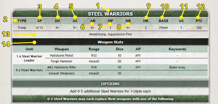 The unit profile template is then shown with labels. These templates are very recognizable and make a lot of sense to most experienced gamers. I like how they include the base size in the unit profile along with points cost.