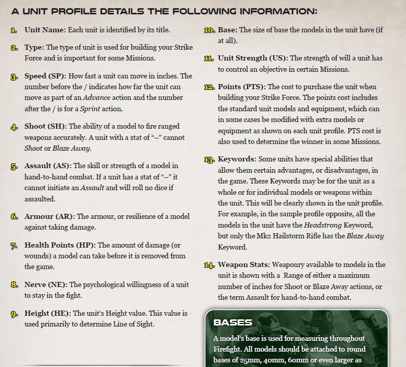 There's a really good breakdown of the profile here showing each stat and what it means. These are really useful for those of us who play many games or people who are just starting in wargaming. As we'll find out later the Height of a unit is included for a little bit of abstracting when Shooting, which I am a fan of generally - true line of sight can sometimes lead to some bad feels when you lose a whole unit due to shooting through a keyhole.