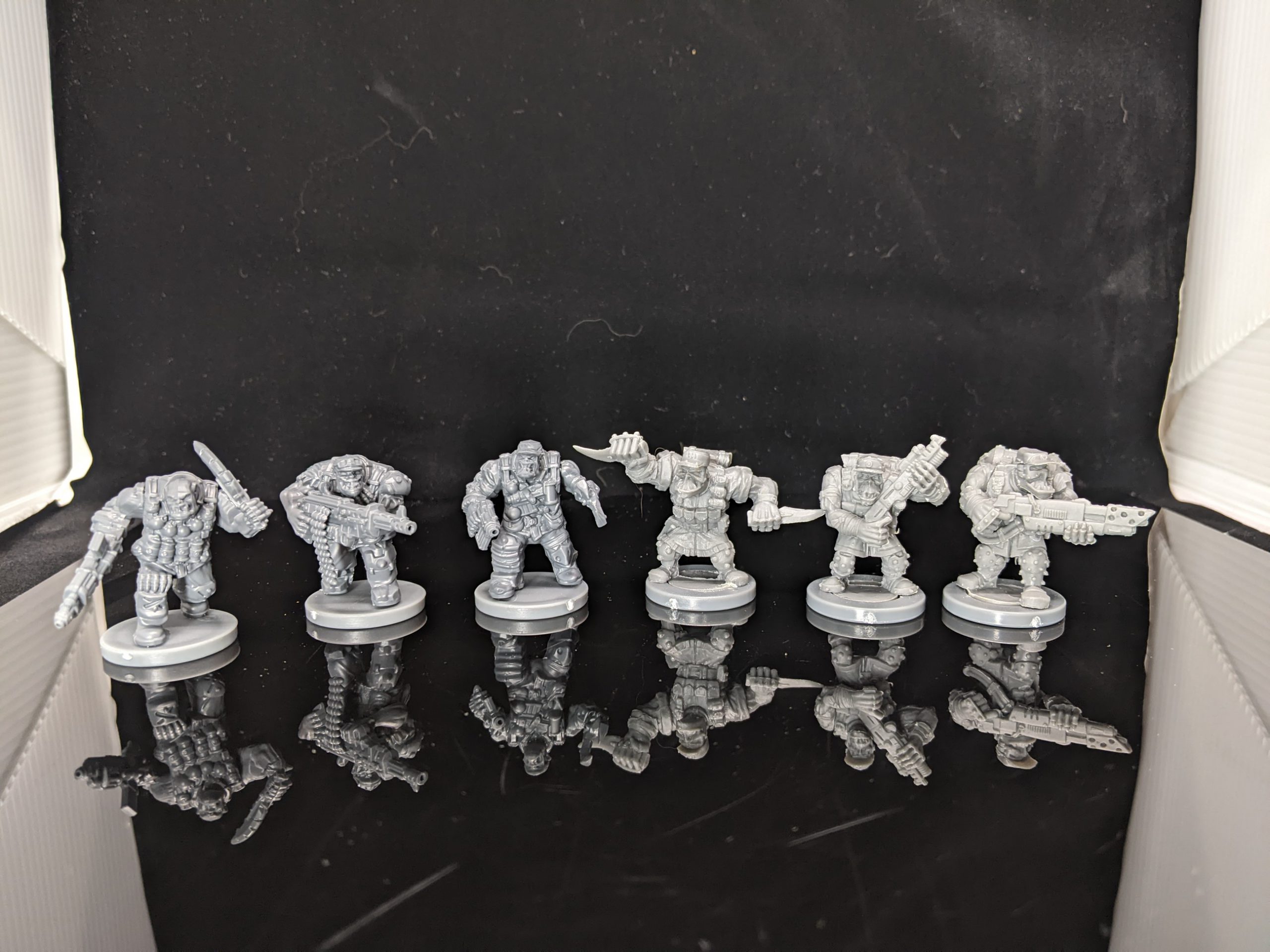 The Marauder Commandos are the only new models in this set - the Enforcers and Ripper Suits initially came out in the Deadzone v1 and v2 Kickstarters. The new models compare really favorably to the plastic resin ones that came with the initial Deadzone release. They’re nice and chunky like an Orc should be. Mold lines are mostly minimal, although they do run straight down the middle of the faces and those are kind of a pain to clean up. When you got 40 of the little dudes though, they’re largely not noticeable.