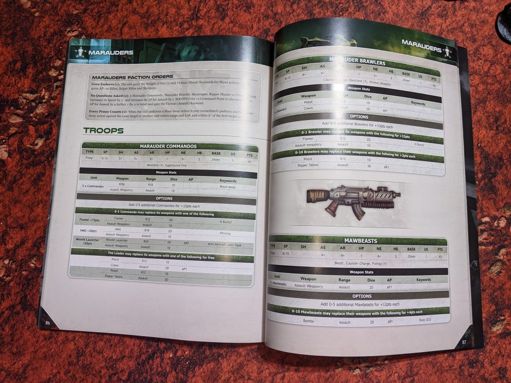 Each force contains roughly 775 points worth of models, depending on what options you take for special weapons or leader upgrades. Noticeably missing is any kind of dedicated Command unit, although there are enough spare parts to build a Peacekeeper Captain for the Enforcers and a Commando Captain for the Marauders.