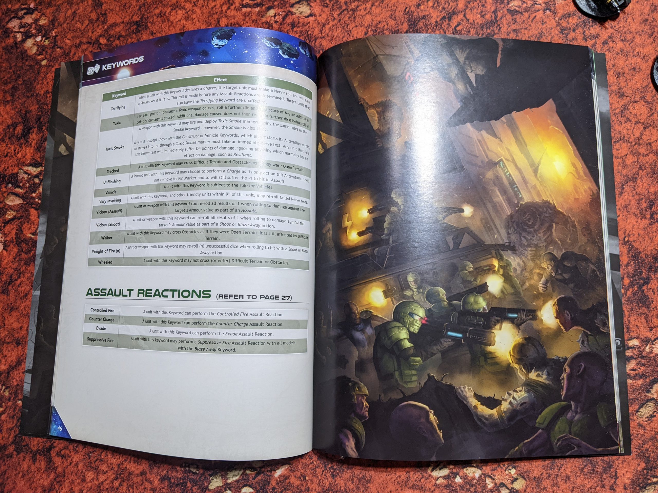 In addition to the models, the starter also comes with most everything you’d need to play. You get two softcover books. The Firefight rulebook contains the full rules for the game, and about 40 pages of background fluff to get new players up to speed on the Warpath Universe. There is a good amount of gorgeous art spread throughout the book.