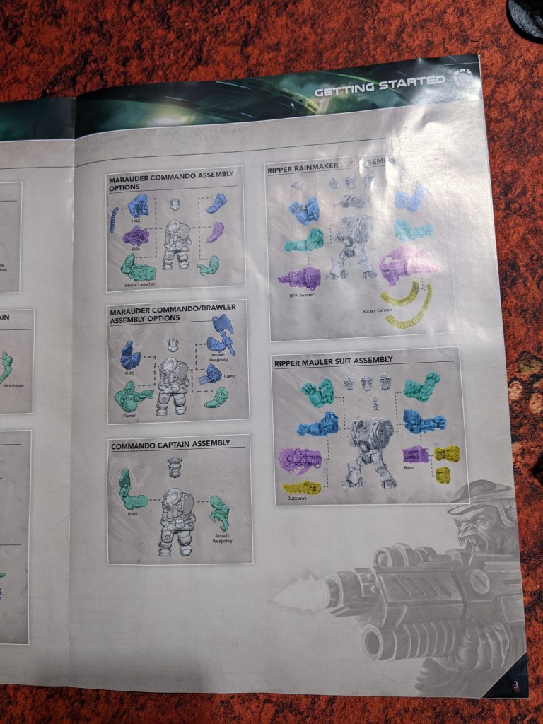 Finally, you get a set of quick play rules to get you started with your first game. You get suggested army lists, basic assembly guides, a sample mission, and a quick reference page. When I say basic assembly guides, I really mean it. They are very reminiscent of the diagram you’d find on old Wahammer 40k 3rd edition boxes. These get the job done, and for the most part matching arms are labeled on sprue, but they leave a lot to be desired. There also is little to no reference for which weapon is which and this can frustrate newer players who have to try and hope google has answers. For example, Commando Leaders and Commando Brawlers have the option for Ripper Talons, which don’t appear to be illustrated anywhere in the force list book. There are some arm combinations that look kind of odd, like the shotgun-style gun that goes with the reloading arm, and confirmation that this assembly would be nice. We’ve been spoiled by exhaustive instructions in modern games, and this is a place Mantic can improve.