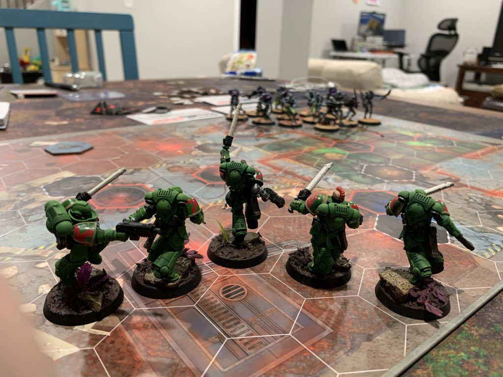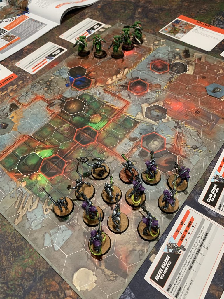 The recommended first scenario is Dual Strike, which is a clean and simple scenario. You start in opposite corners and score points by holding objectives. There are two fireteams included in the box. A 5-man Space Marine squad built to close the distance and fight up close and a ploddingly slow 13-bot Necron squad that makes up for it with punishing attacks at range. This asymmetry alone provides tension to that scenario. The marines can (and likely will) be able to take both objectives in the first round and unless you opt for certain Strategic Ploys your Necrons will almost certainly