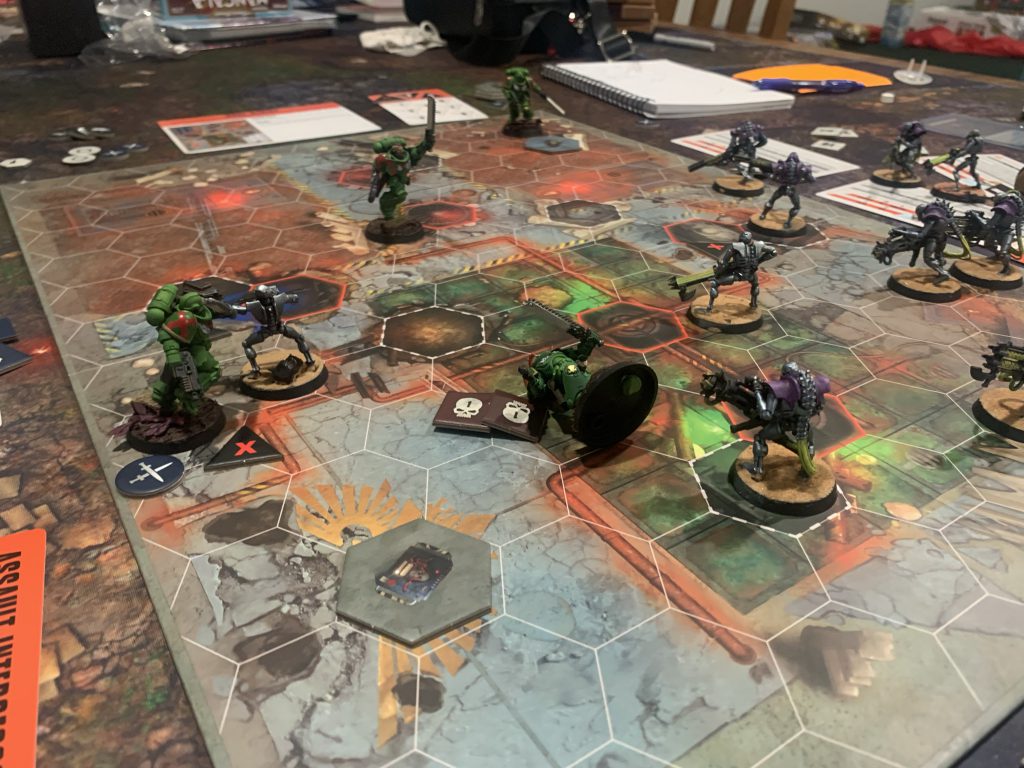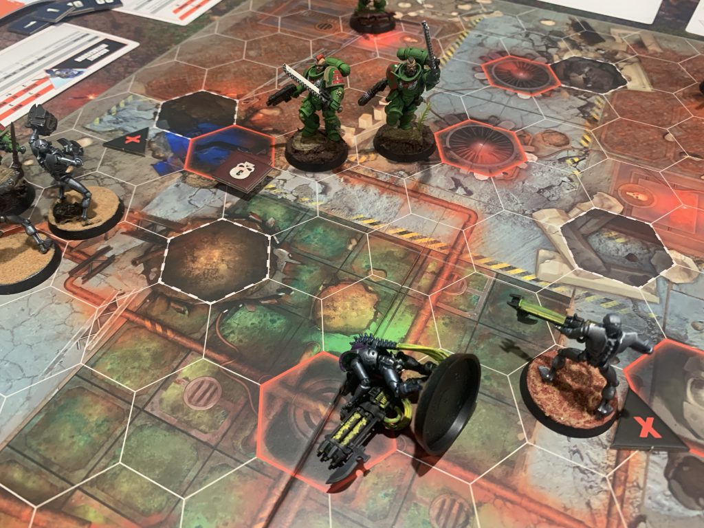 The Scenarios also provide the cinematic engine that is a hallmark of Games Workshop games. In one game of Uplink, a marine bolted across the board and stood between two control panels. Using his actions to take control of both panels meant he stood exposed, slowly withering under a hail of fire. On the other side, a slow horde of Necrons stumbled inexorably towards their control panel. While the Marines could steadily pick them off, late-round exhaustion set in (represented by diminishing action points) and eventually the Necrons broke through the fire and took control. Again the scale is small, but these are the moments Black Library books are made of.
