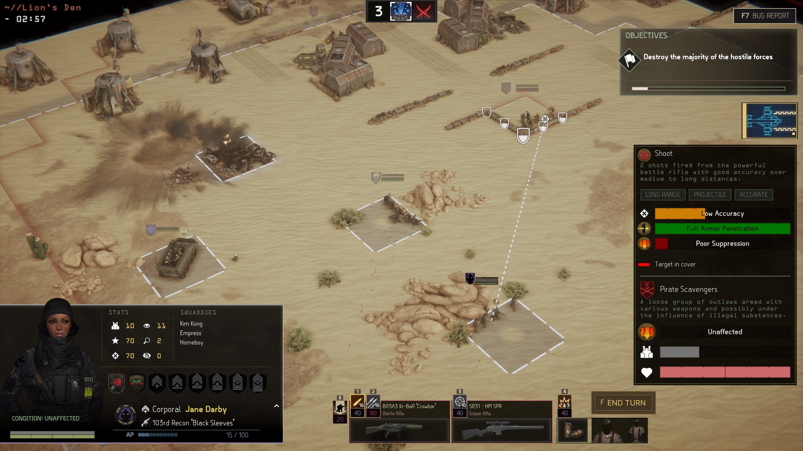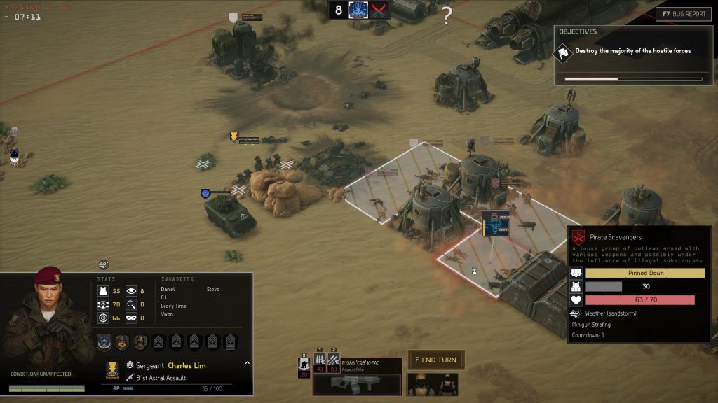 Menace does have RNG. It has RNG to-hit rolls, RNG damage, and lots of secondary RNG sprinkled on top. Shots can miss targets to strike other squares. An anti-armour weapon can land a sub-standard damage roll. Suppressed units are less accurate. All of that RNG could be a recipe for disaster, but the game is tuned to make the Law of Averages dominate. An infantry squad's rifle fire is not a single burst or shot. Every available rifle fires a burst, and