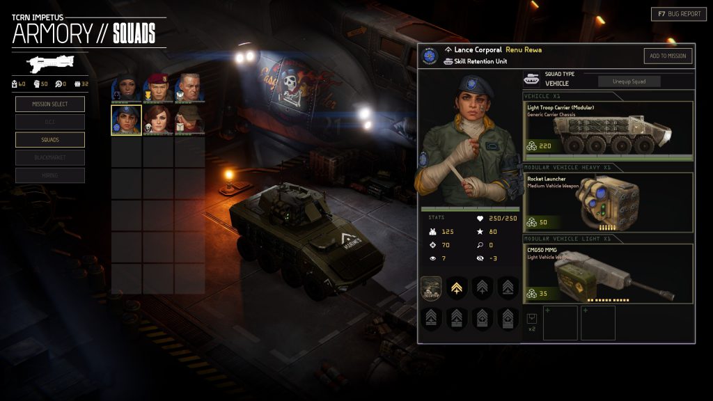 Jagged Alliance 3. Vehicles are treated like squads. A vehicle is one unit and you get a vehicle commander in lieu of squad leaders. They get a perk tree. The only vehicle commander in the demo is Renu Rewa, who has PTSD-related anger issues and