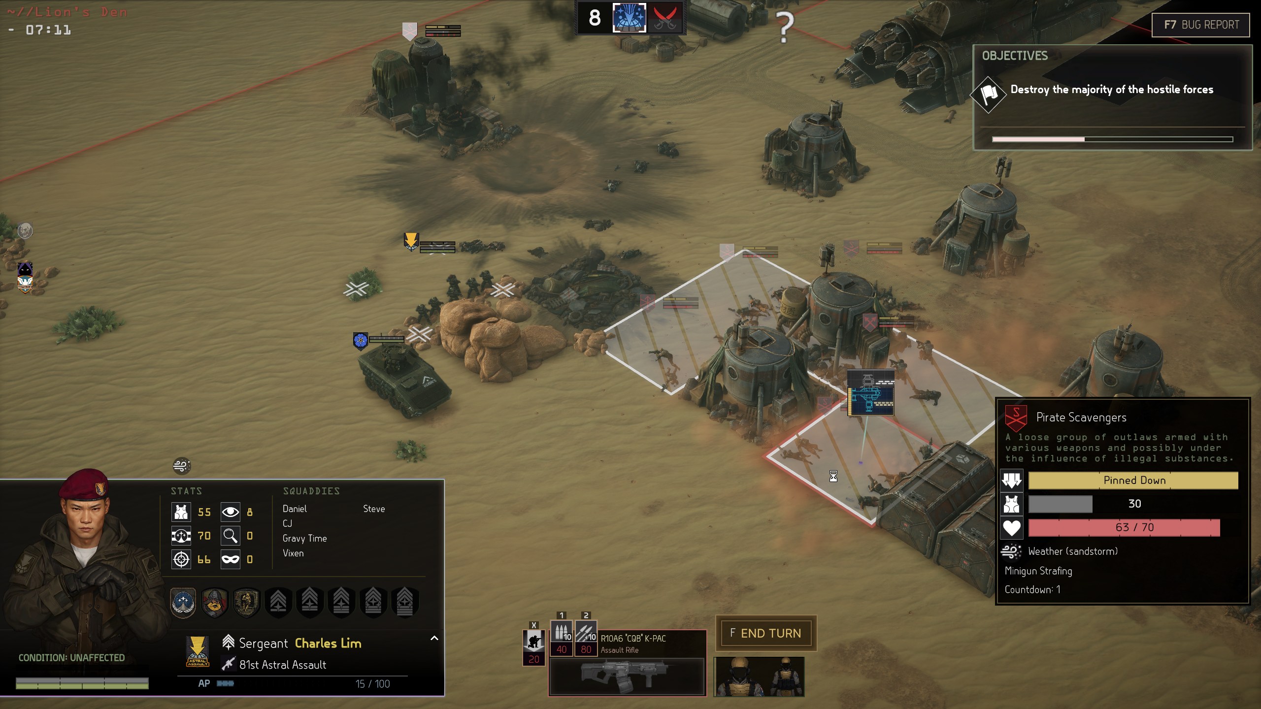 Pinned. A Pinned unit goes to ground for a massive defense boost, loses all AP and at best, can crawl pitifully for cover. Unlike other games in the genre, you do not win firefights in