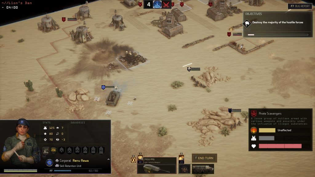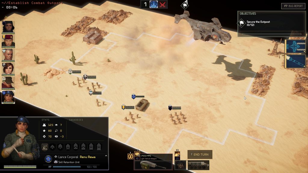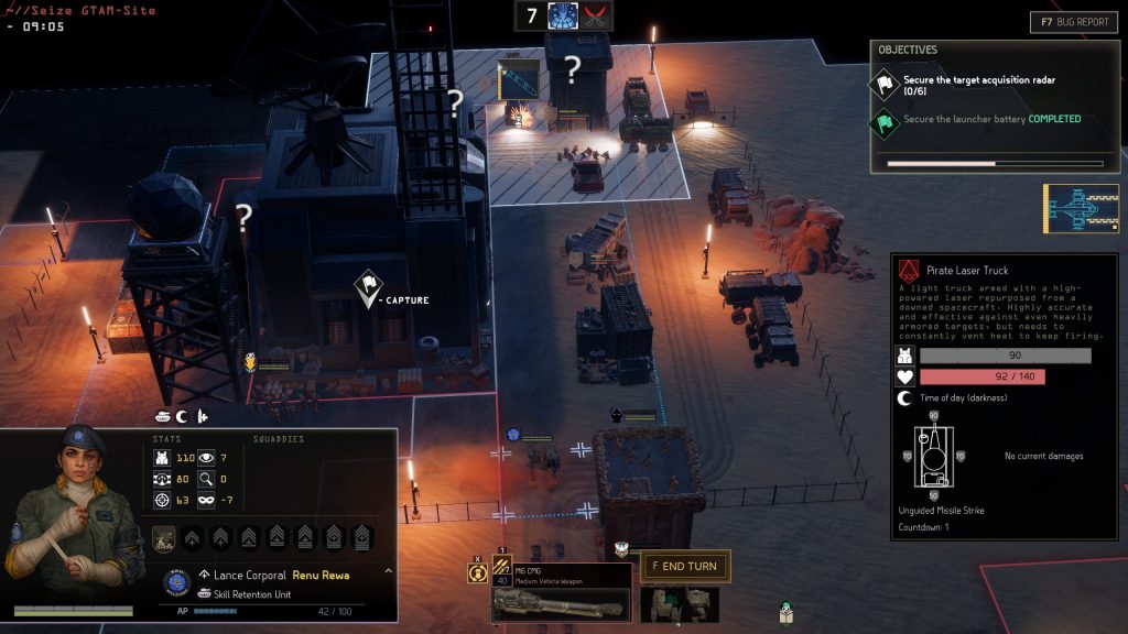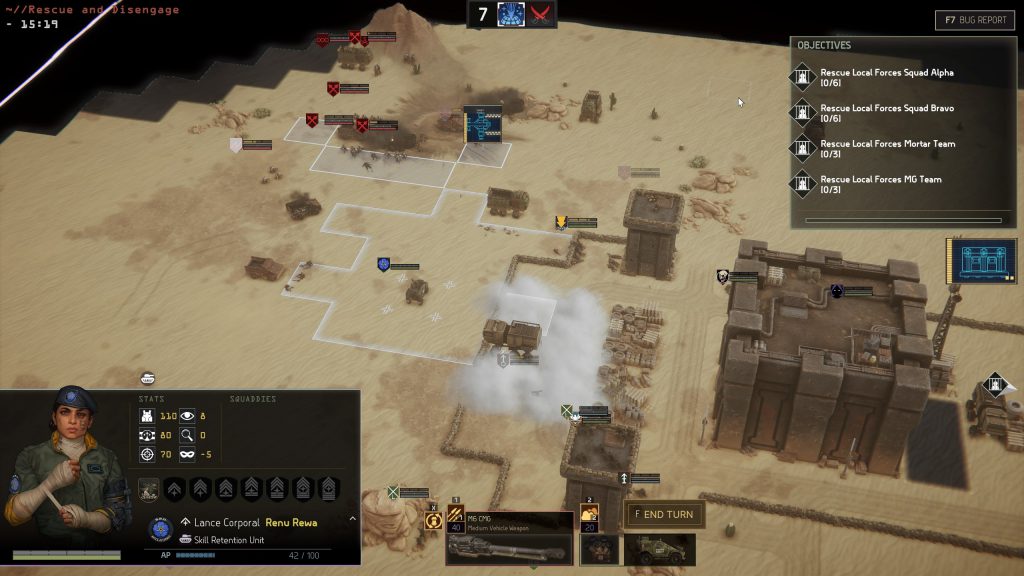 Menace is further accessorised by complex, but intuitive secondary systems. Different terrain types impose different AP requirements to cross. Terrain is destructible. A heavy rocket leaves a crater that provides cover. A wrecked building still provides limited protection. Dust storms make the entire battlefield more hostile. Nighttime reduces everyone's vision radius and concealment – unless you have night-vision gear. A trail of fire left by a damaged flamethrower truck is hazardous to infantry well-being. Any of these concepts warrants a long Reddit post about coping and turning it to your advantage. But once you make contact, it's just part of the game. The battlefield develops (and collapses) as combat drags on and it's on
