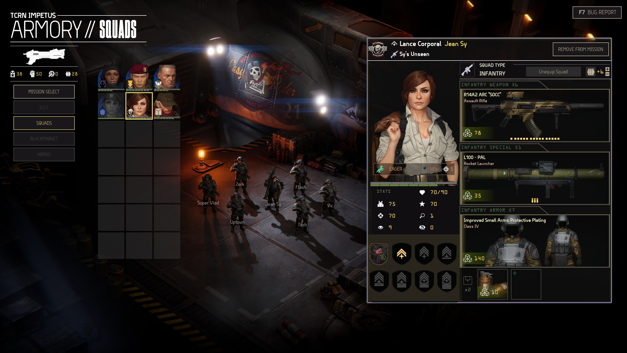 Your squads are defined by a Squad Leader (SL). SLs are named and voiced characters with backstory, character interactions, and perk trees. Charles Lim is an ambitious, brash marine who favors mobile aggression. Jane Darby is collected under fire and her perks are tailored to accuracy and stealth – a natural pick for sharpshooting. Each SL's skillset lends itself to particular weapons and roles, but there's room to flex. I've had great success running Jane in a minimum-size squad with no armour and a bolt-action rifle as a cheap sniper team. Edwin Pike (a by-the-book veteran) handles himself well leading a 3-man machinegun team. Meanwhile, my Charles Lim loadout is mid-sized, totes SMGs and a grenade launcher. Their face-kicking loadout is completed with
