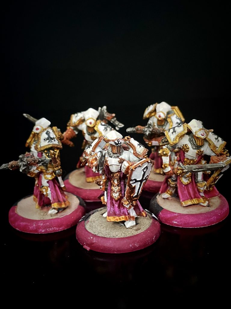 Swiftblade: I move me Exemplars onto the hill for the defense bonus then pop another command card to give them stealth, and move my caster to touch the flag and cast Sacrosanct. This spell causes enemy warrior models to be knocked down if they box one of my models in Kreoss’ control range (we misplay it here and play it as all non commander models and not just warrior models, which I don’t feel great about!) I move one unit of Knights Exemplar onto the zone, and keep the other off of the zone. This will probably cost me one unit of Exemplars when the Bane Warriors get stuck in, but sacrosanct should make the counterattack next turn with the other Exemplar unit even easier. I keep the Crusader close to Kreoss for countercharge threats and make sure the choir keeps protecting my jacks from spells.
