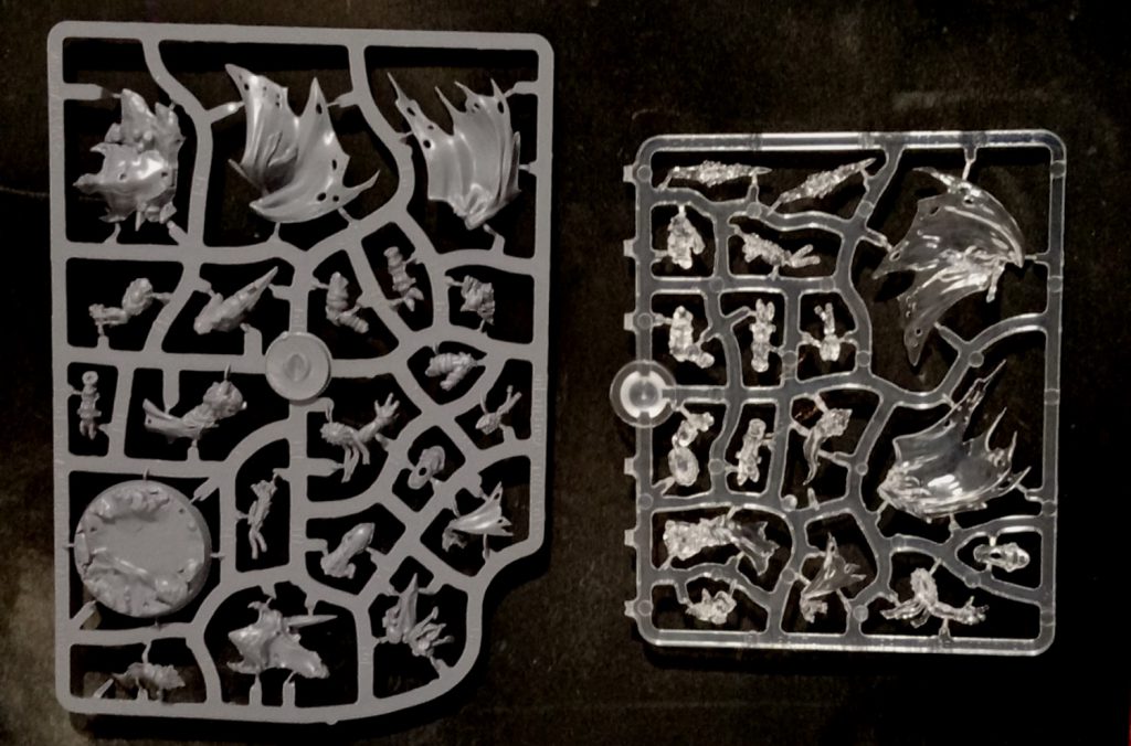 Translucent/Transparent materials: All three factions appear to have a tonne of clear or coloured plastic parts to the sculpts. Initially, I had very mixed feelings on them at first because, as snooty wargamers, we don’t deal with coloured plastics (please disregard the classic Necron line), we paint our grey plastic to look like muzzle-flashes or glass visors and we damned well like it. Leave the coloured plastics to…cough other games.*