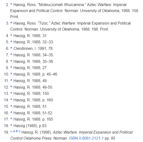 Aztec Warfare - how the Aztecs fought, how they were organised, why they fought, what the flower wars were and all of this key information - was a good beginning, but, like many wikipedia pages on academic subjects, you can look in the references and see that it's simply a fairly poorly condensed version of one guy's work - Ross Hassig. A flip through an old Osprey - Aztec, Mixtec and Zapotec Armies - revealed exactly the same reliance on a single source.