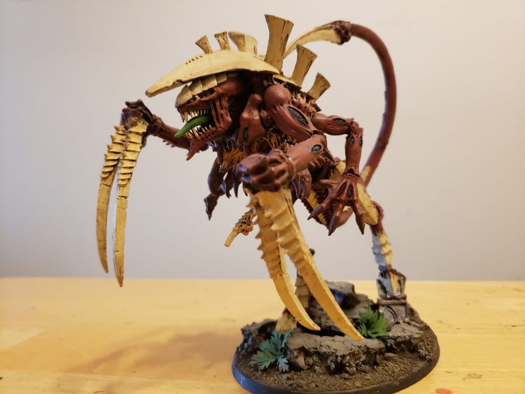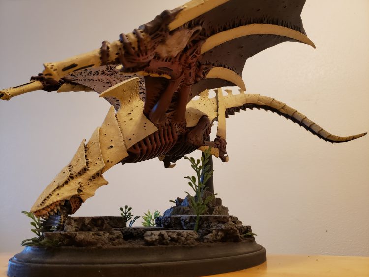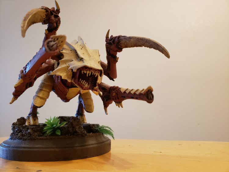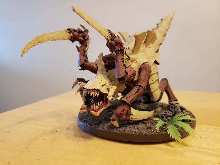 The Hierophant is a towering Lord of War that is supposed to trade fire with the Titans of the Imperium. Protected by Bio-titan Warp Fields and a high wound value, these monsters can hammer into any unit they want and are also close combat threats to be scared of. Now, the issue, of course, is the sheer size of these long-legged Tyranid titans. Due to their size, Games Workshop had the foresight to give them the Fly keyword. Thanks to this, the feeling of their height is fully realized as they stride over terrain features and units. The biggest issue here is again their playability on the table. Though they may have fly, imagine having a base on these guys, crushing the terrain they move over. To actually play this model on the table, I don’t think a base can actually be used.