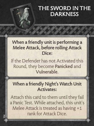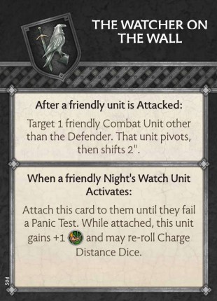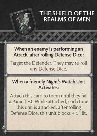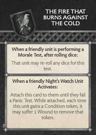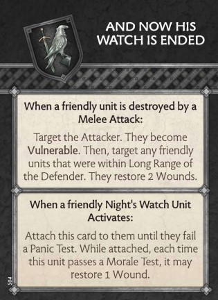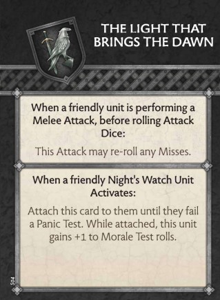 Re-roll misses on a Melee Attack or attach for +1 Morale Test rolls. This one is weak in value due to re-rolls not being that uncommon in the Night’s Watch deck, but the attach effect can benefit a Unit greatly if it already has other cards on them. To attach cards the trigger is when the Unit Activates, so it is something you want late game when you already have cards on. If players draw this early on, then they are dumping the card at first chance unless they want to show the opponent which Unit they plan to buff up with cards. Perhaps changing the re-rolls to something that would be helpful early on can then allow this to play differently depending on when you draw it in game.