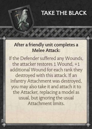 Take the Black has not changed too much from its previous iteration. It still heals when you attack an enemy and can still grab an Attachment if one is available. It is a slightly worse version of Fueled by Slaughter now since the ranks counted must be from the Unit’s Attack and not in general, but rather than it being played when you destroy it Unit it can be played after an Attack giving it more opportunities to be played. I can still see some NW players waiting for an Attachment to steal for the fun aspect of this card.