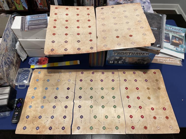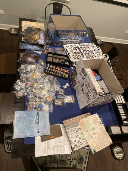 Then my kiddo graduated and went off to college, and we didn’t know how to continue with our speediest character on the other end of the state. It has sadly sat on the (lowest, for weight safety reasons) shelf in our game room, patiently waiting for the next winter or summer break when we’re all in the same house again. In the meantime, we saw the KS for Frosthaven drop. “Another Gloomhaven?” I asked. “Gloomhaven, on ice, bigger and better!” was the response. Surely not LITERALLY, PHYSICALLY bigger, right? Friends, they were not kidding.