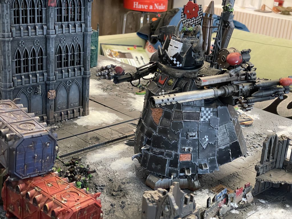 It's easily the most ambitious mission from a design perspective; the concept is that a tiny force (5-600 points) take on a Stompa in incredibly dense terrain. When the battle begins, the Stompa starts flattening the battlefield as it pursues its tormentors, a bit like a cross between