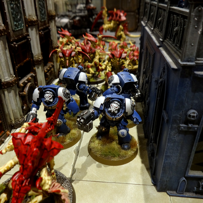 Cobalt Scions Terminators hold the door against Tyranid Warriors. Suicide Gladiator can be seen in the distance. Credit: Charlie Brassley