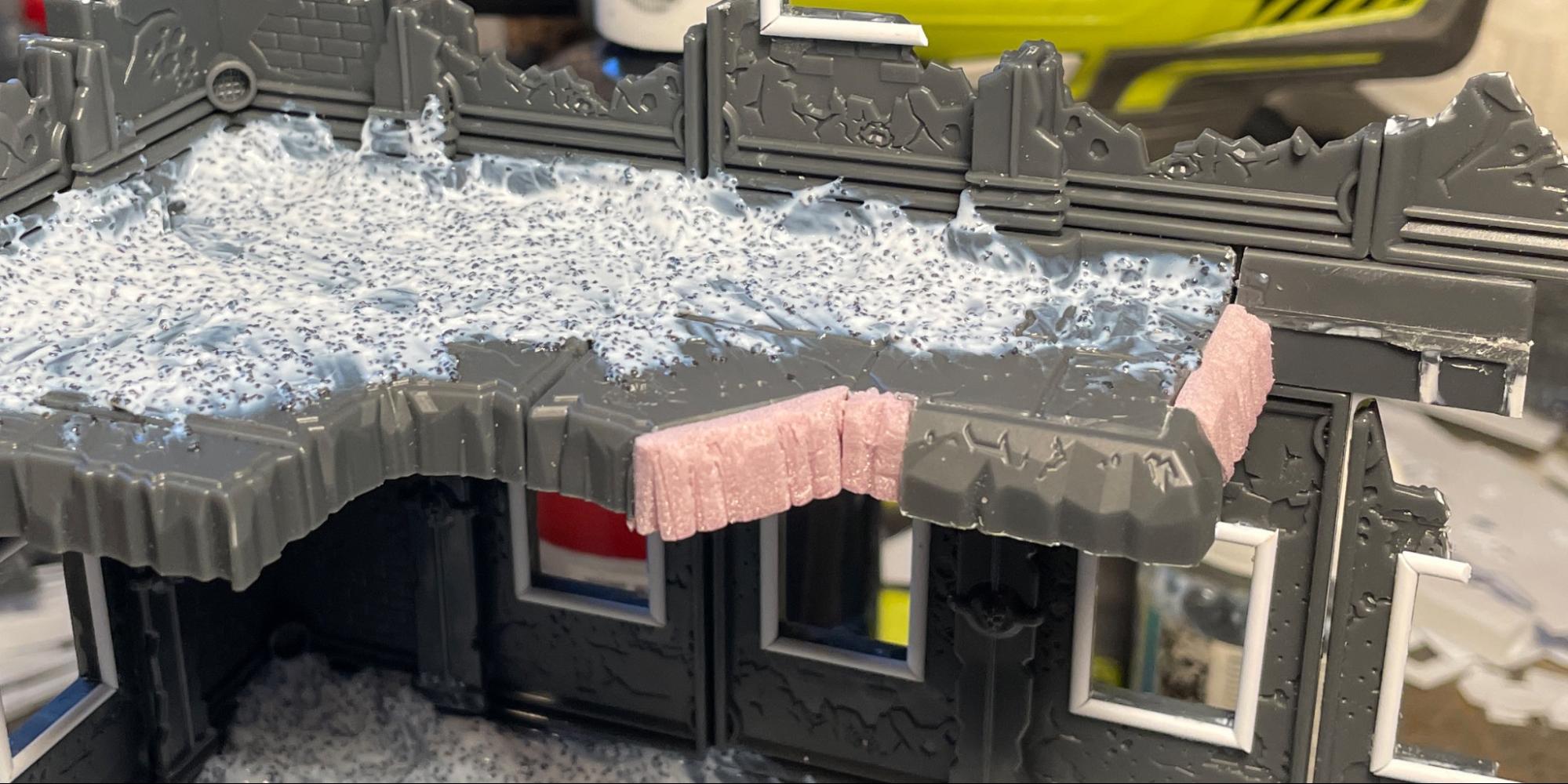 First, I carefully cut out a chunk of outer-corner floor edging. And to fill the rest, I used some pink insulation foam, which I carved to be a similar texture as the plastic. Before painting, I put on two coats of black acrylic paint to protect it from the sprays I was using to undercoat the whole piece.