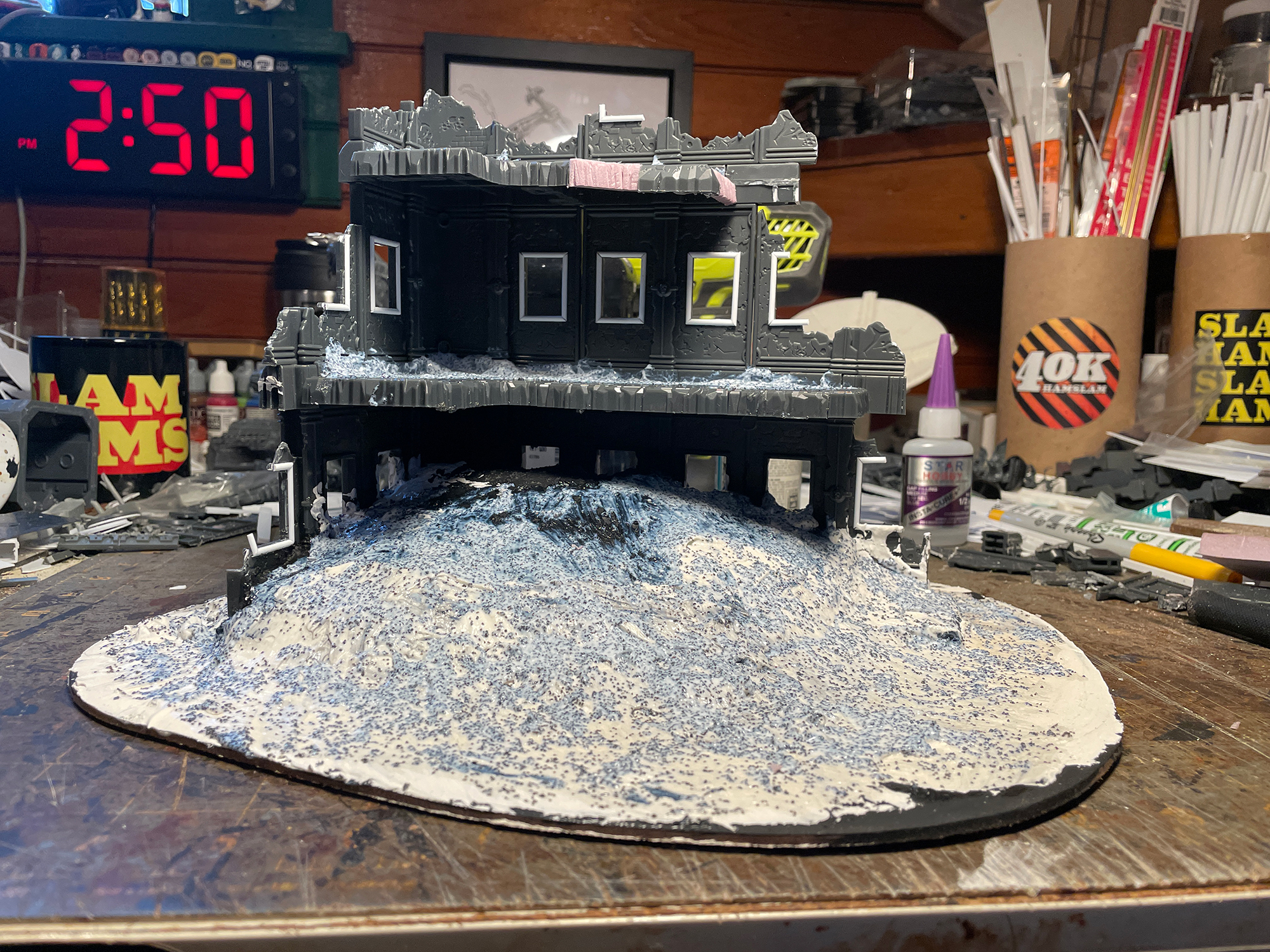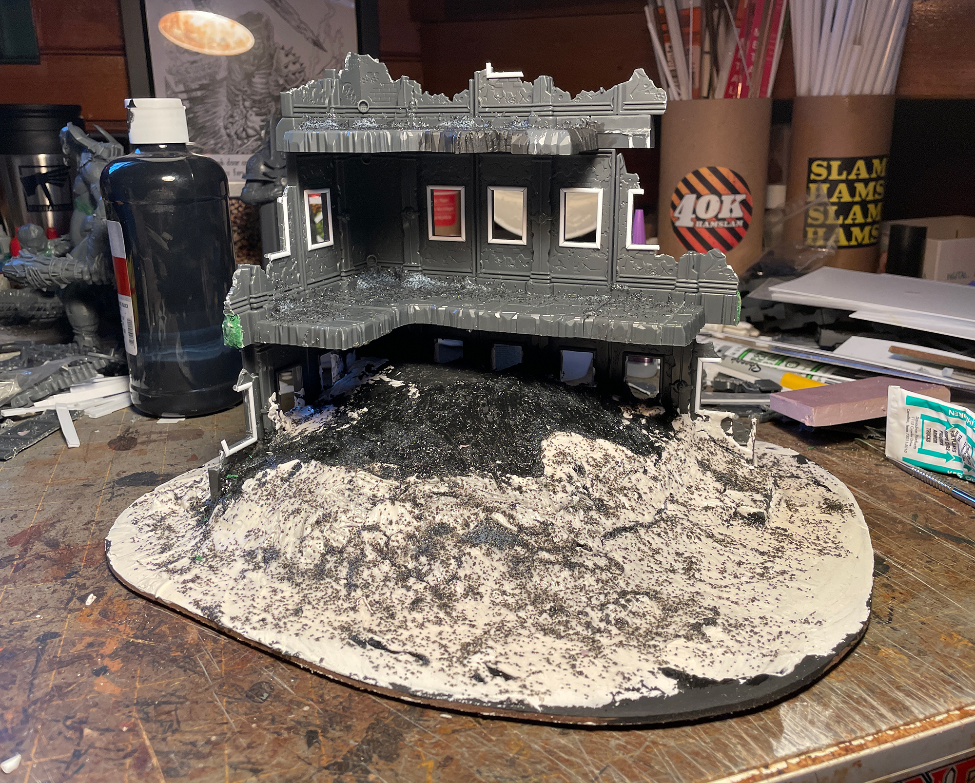 After that was dry, I was left with a few cracks where I laid the spackle on thick, so I broke out the texture paste again and painted it all over and this time, added build up to the upper floors, so it would appear that ash had collected up there as well.