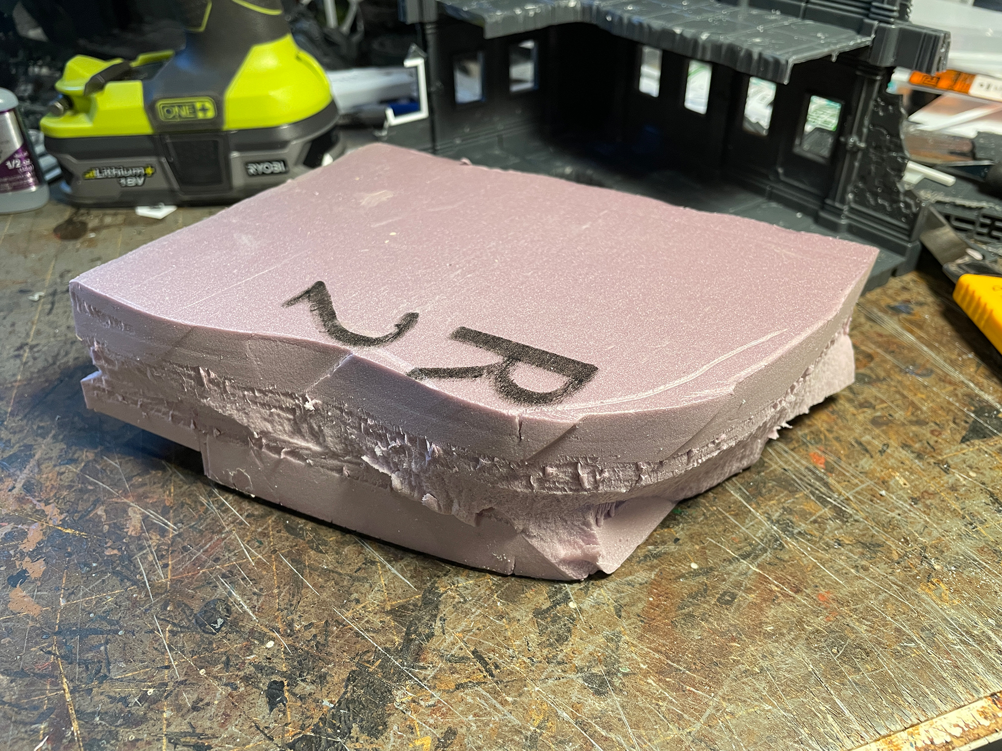 Be sure to test that it fits before getting ahead of yourself. As you can see here, the foam fits well on the ruin, and lays flat. It doesn't have to be a perfect fit, you don't need to carve out the perfect negative of the plastic or anything. Not even close. It just has to be close enough that it feels roughly correct.