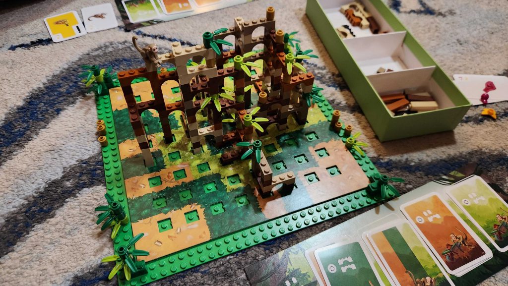 Being Lego there's very little risk of anything falling over and besides that's not the point of the game anyways, regardless of how much this may resemble Rhino Hero. Instead, the game ends when the bricks run out, at which banana points are tallied and the player with the most points is the winner. There are some Catan-like scoring bonuses you can snag, and planning your final turn around when the bricks will run out is key to finishing strong. There are different boards you can start with that change up the strategy and early builds a bit if you want some variety later on.