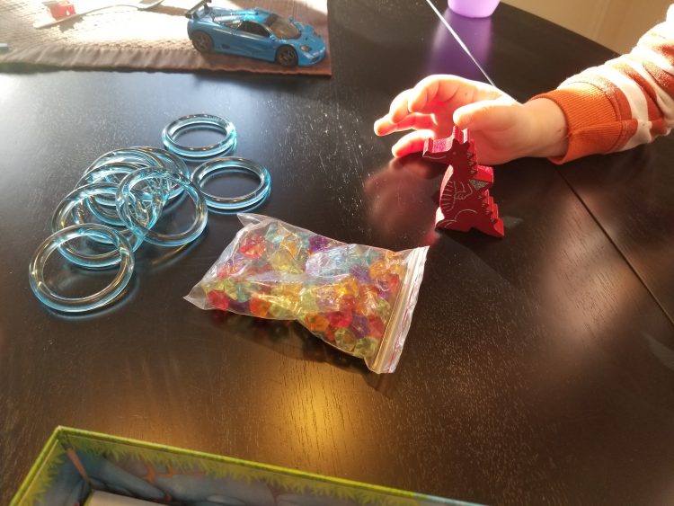 The gems that players collect are placed in a hole behind their chosen dragon, where they fall into the storage area under the board (this is all neatly set up within the game's box). After all the rings have been removed from the pillar, the players tally up the total number of gems they nabbed and the player with the most wins. In a given game you'll usually end up with 10-20 gems barring some really lousy luck, and that means opportunities to count with your child multiple times and explain concepts like "more" and "fewer," which is cool too.