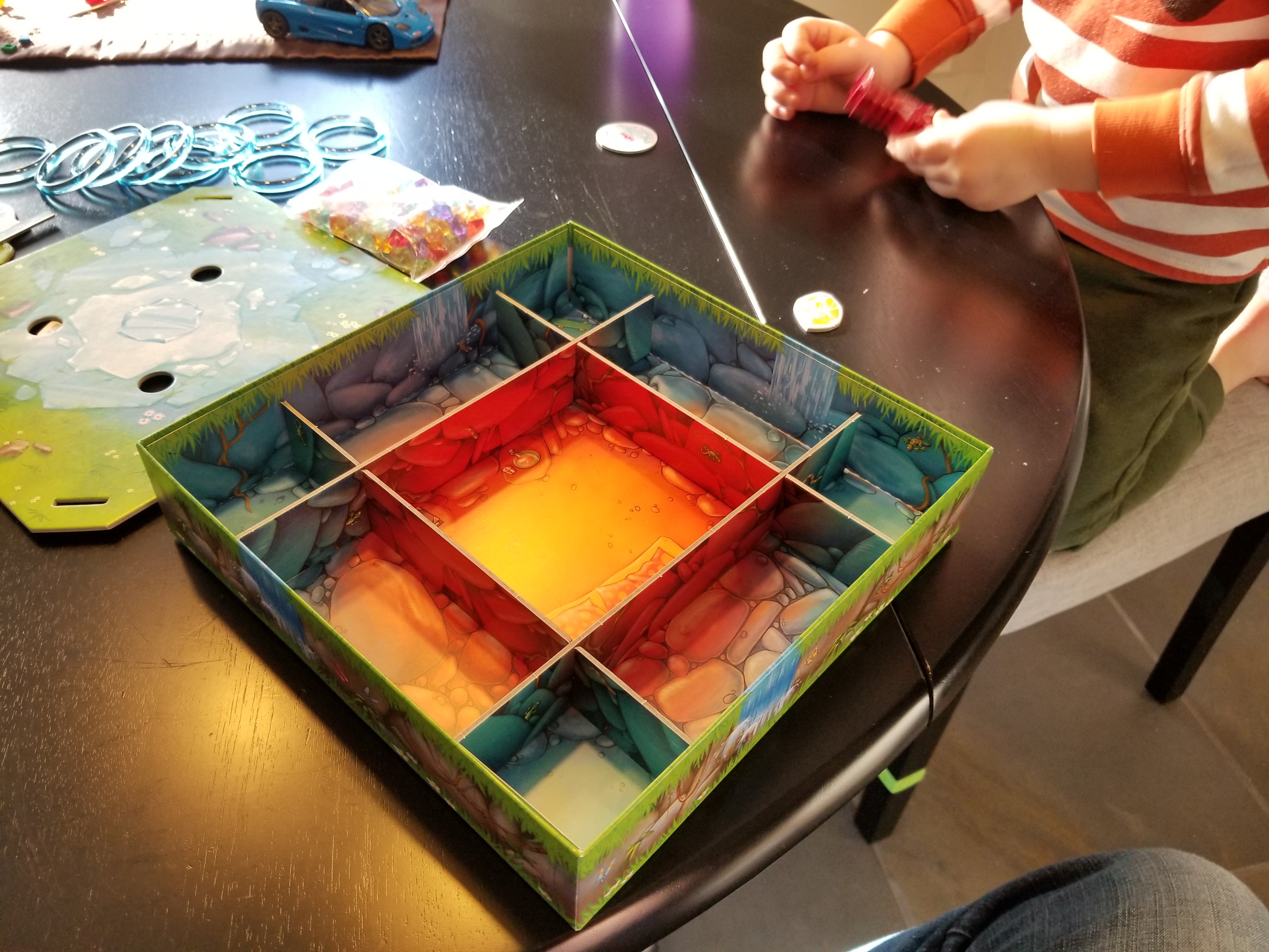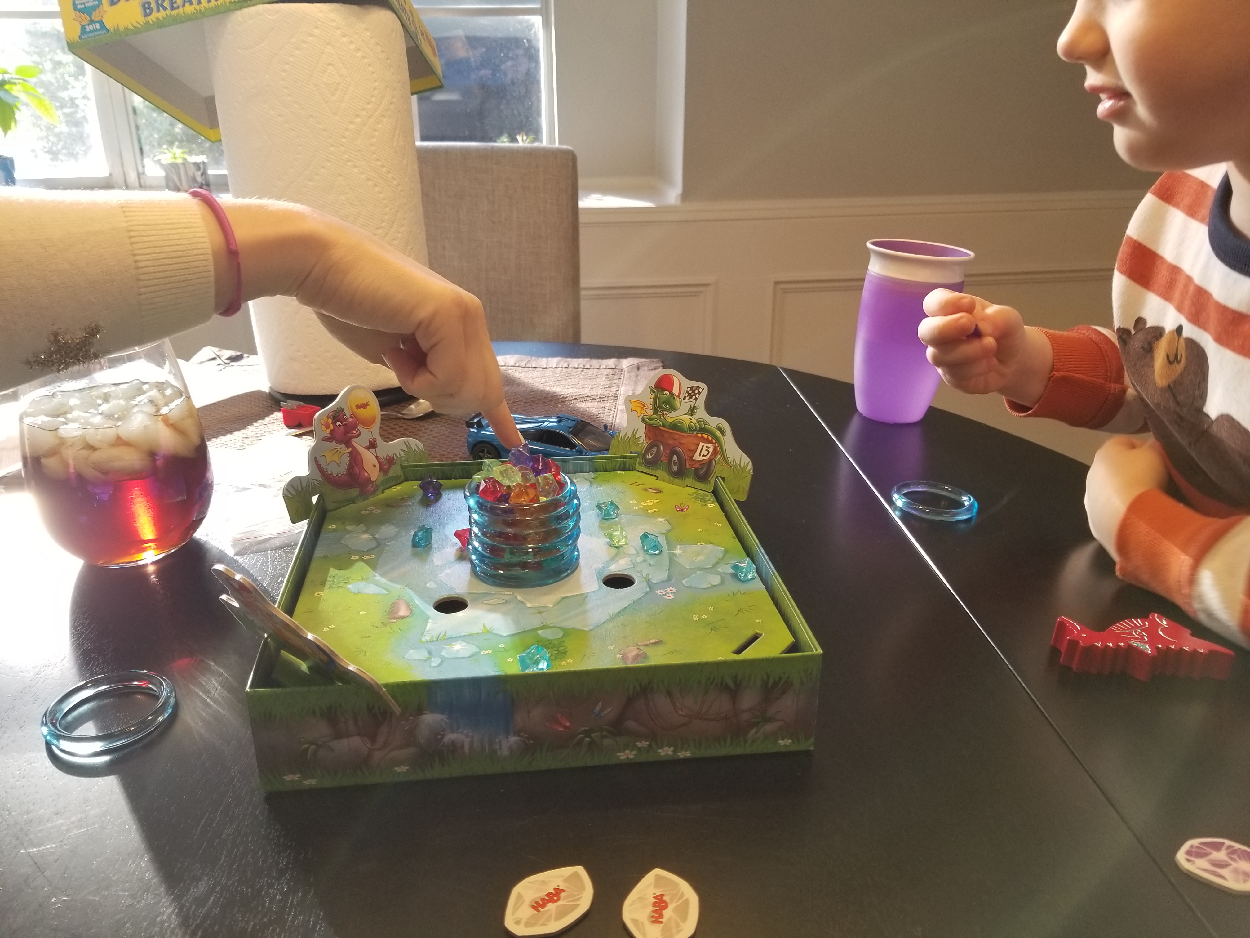 first game - it's simple enough to explain, helps with color recognition, and was the first board game I was able to legitimately play with my son. But the downside to the game being great as an introduction for three year-olds is that its core concepts are pretty easy to master - my son quickly picked up the core skill of "being able to land the magnet on the fish he wanted to catch," making the game an exercise of rolling dice and taking turns. Now that he's four, we needed a new game. So while I was at my local game store this past week for some last-minute gifts, I let my son pick a new HABA game off the shelf for us to try out. Naturally, he picked