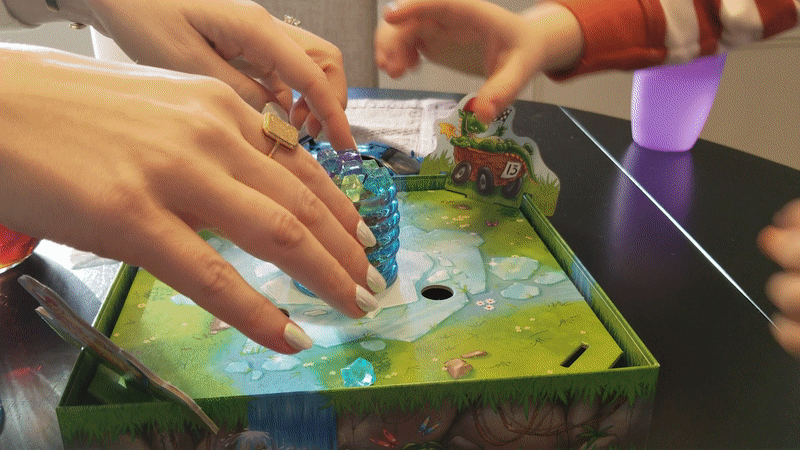 Players then alternate taking turns, choosing colors of gemstones to hunt for and then removing the top ring of the pillar. When they do so, gemstones fall out on the board (any that fall in the holes near the tower are lost) and players collect the color of stones corresponding to the color they've chosen that turn. This means that how many stones you collect is primarily random, but there are a few ways you can adjust play to mitigate this if you're looking to introduce some basic strategy to the game. A big part of it is still going to be the coordination required to remove a ring and then identify which colors to pick up and put in your pile, so it's also great for solidifying color concepts (the colors in the game are red, purple, orange, green, and blue).