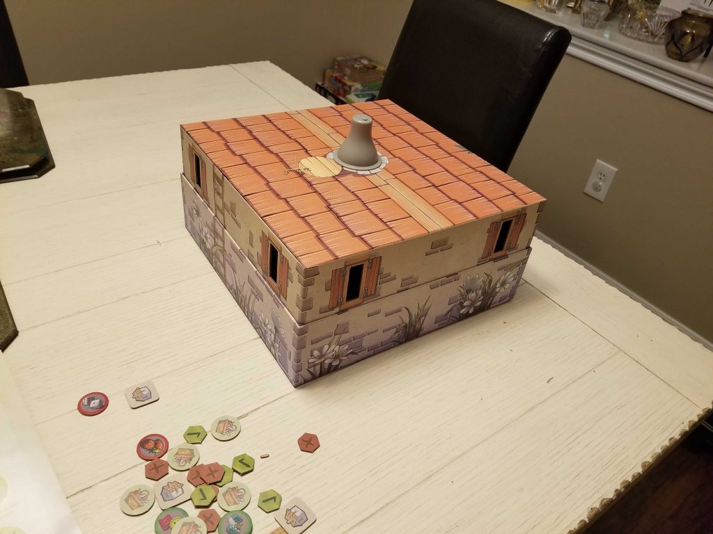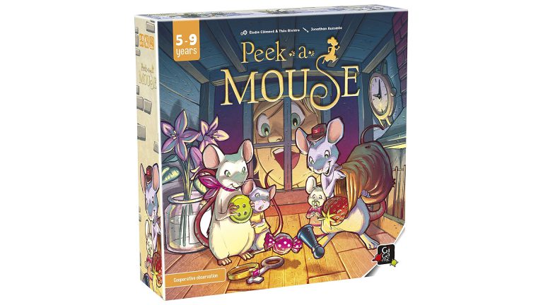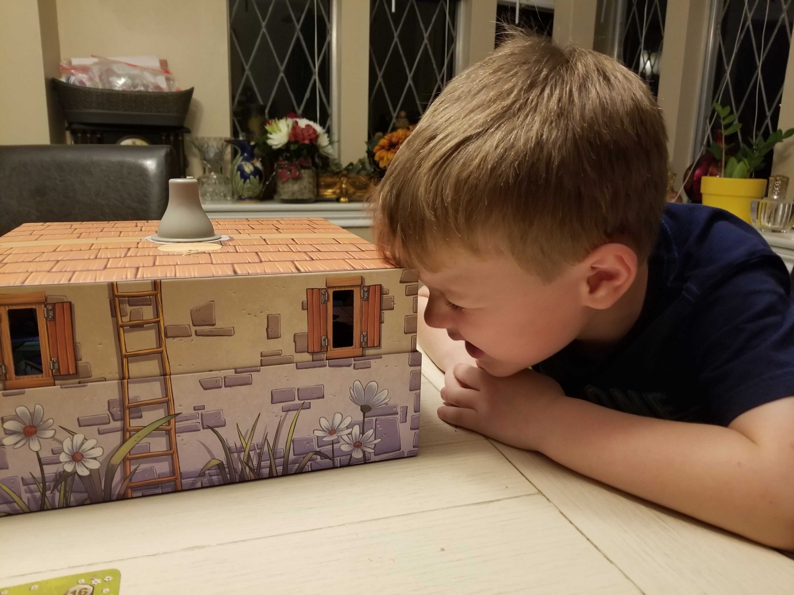 Peek-a-Mouse is a memory game that's equal parts memorization, detective work, and voyeurism simulator. The box itself becomes the board, containing a miniature home for the game's titular mice, who have "borrowed" a variety of household items from your house. Each round, players drop a series of item tokens into the box, which is split into four rooms - kitchen, bedroom, bathroom, and study - and then turn on the light that slots into the top of the box.