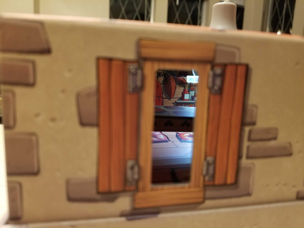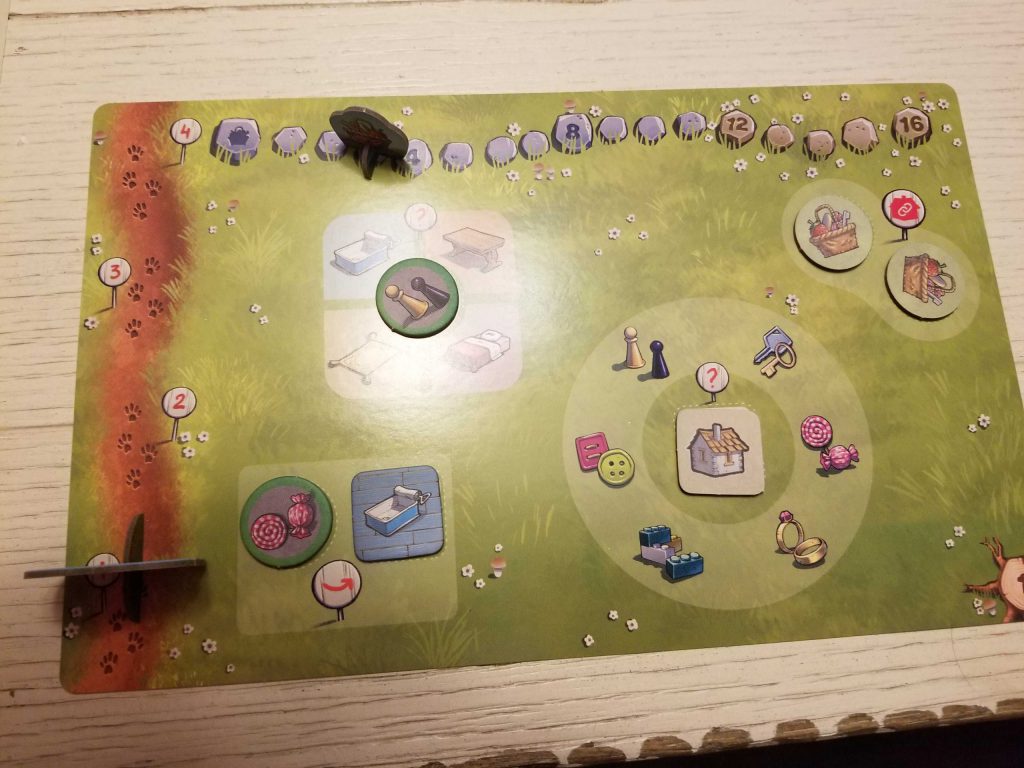 The scoring/question board. You'll randomly generate tiles to place on here corresponding to different questions. For example, the upper left question asks "In which of the four rooms was the chess piece?" While on the lower left is the question "is the candy in the bedroom?"