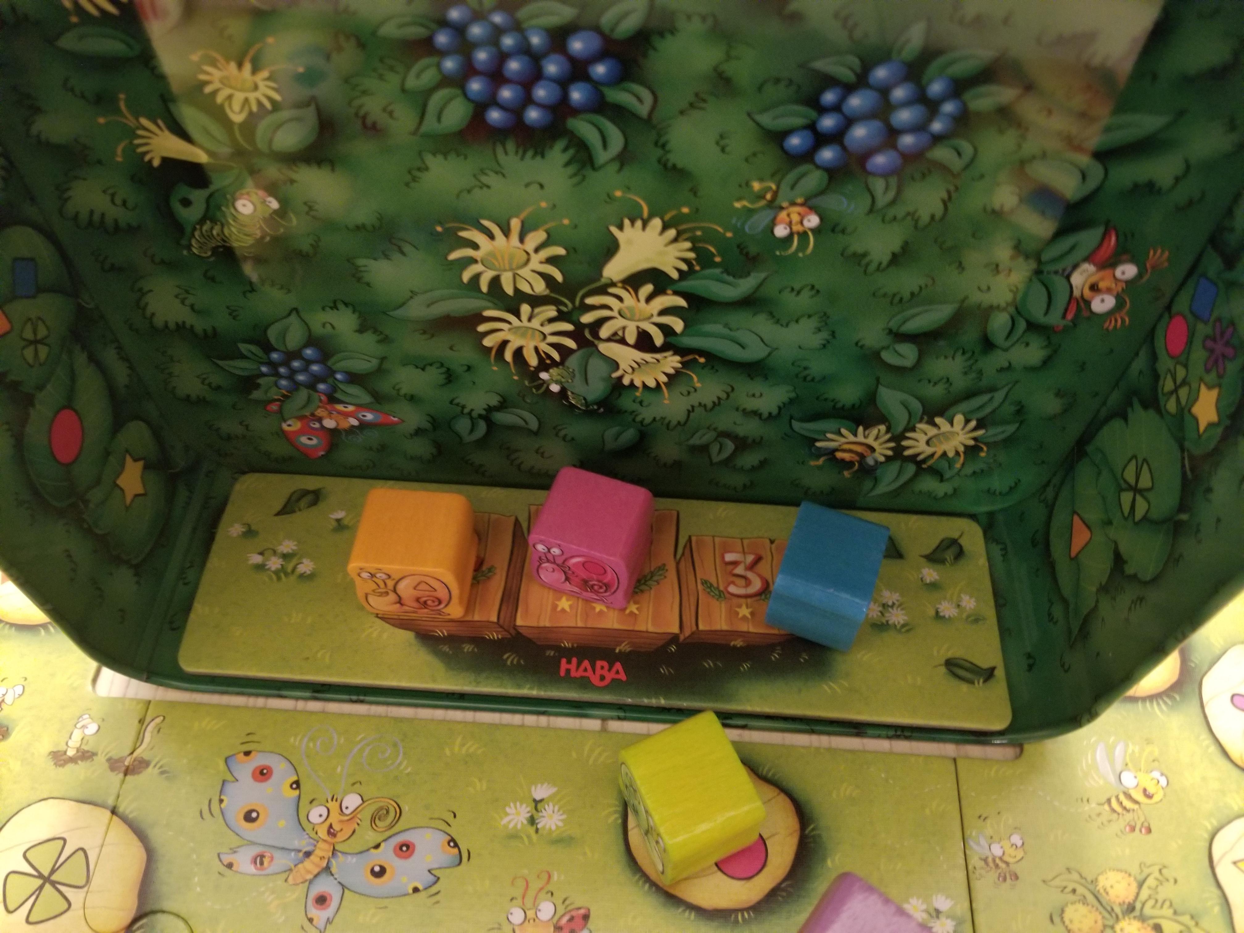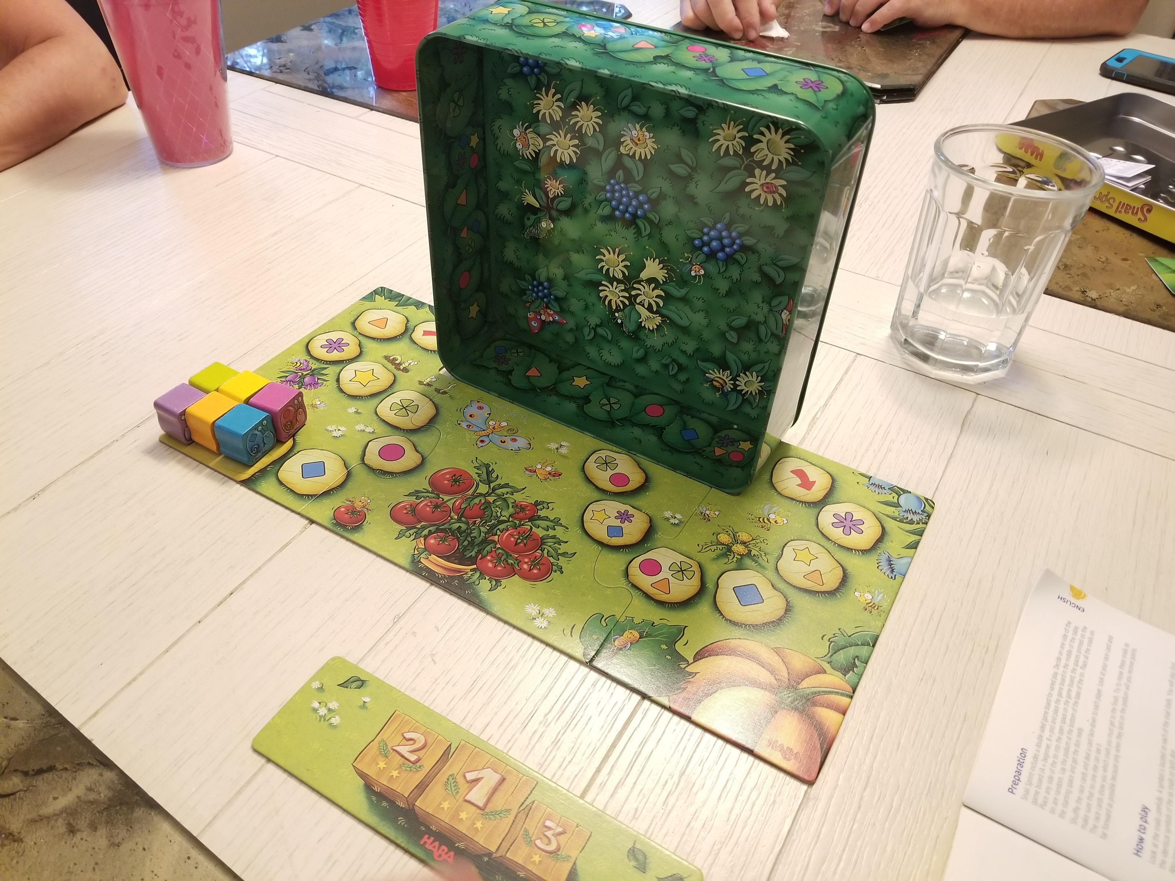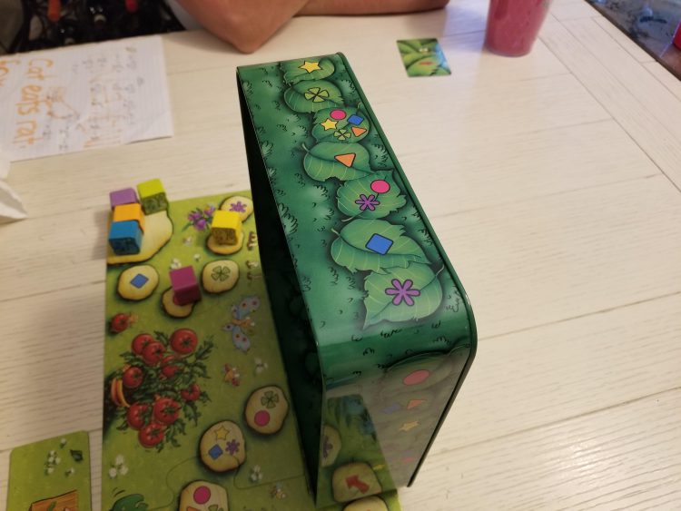 The metal box for the game was something I initially felt was A Bit Much but actually turned out to be relevant to the game itself. One of the more clever conceits visually is that the game's board wraps around the sides of the box - which you can rotate to mix up the game's board. As play progresses, the snails - which have magnets embedded in them - travel along the outside of the box as well. The whole thing is pretty fun but will likely mean your kid standing on a chair to reach those spots if you're playing on a kitchen table so just be ready for that.