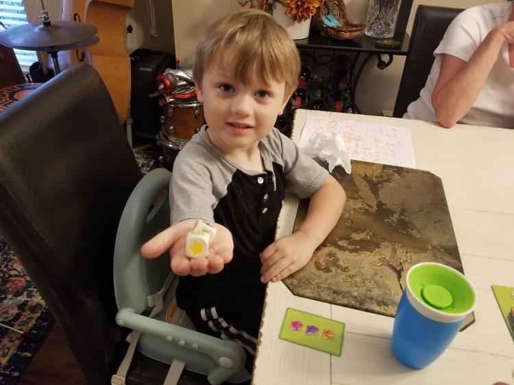 Conceptually, the game can be a bit difficult for a four year-old to understand in its base state. You *could* simplify it to just rolling to get through the track first if you needed a version of this game that's super-simple - pushing a snail to whatever the next color space you roll on a single die will certainly work as a way to do a quick, boring game with no decisions. Beyond that, the tough part is getting the kid to understand that they need to push the three snails on their card, and do so regularly. There's a little bit of strategy involved in that you can "trap" a snail in place by moving onto them; a snail can't move if it has another snail on top of it and snails can pile up high. But the core learning opportunity here is largely helping them understand the central mechanic of pushing their three snails toward the finish line and how to connect the dots of "roll a purple and an orange, figure out which of those you have and move them to the next spot of the other color."