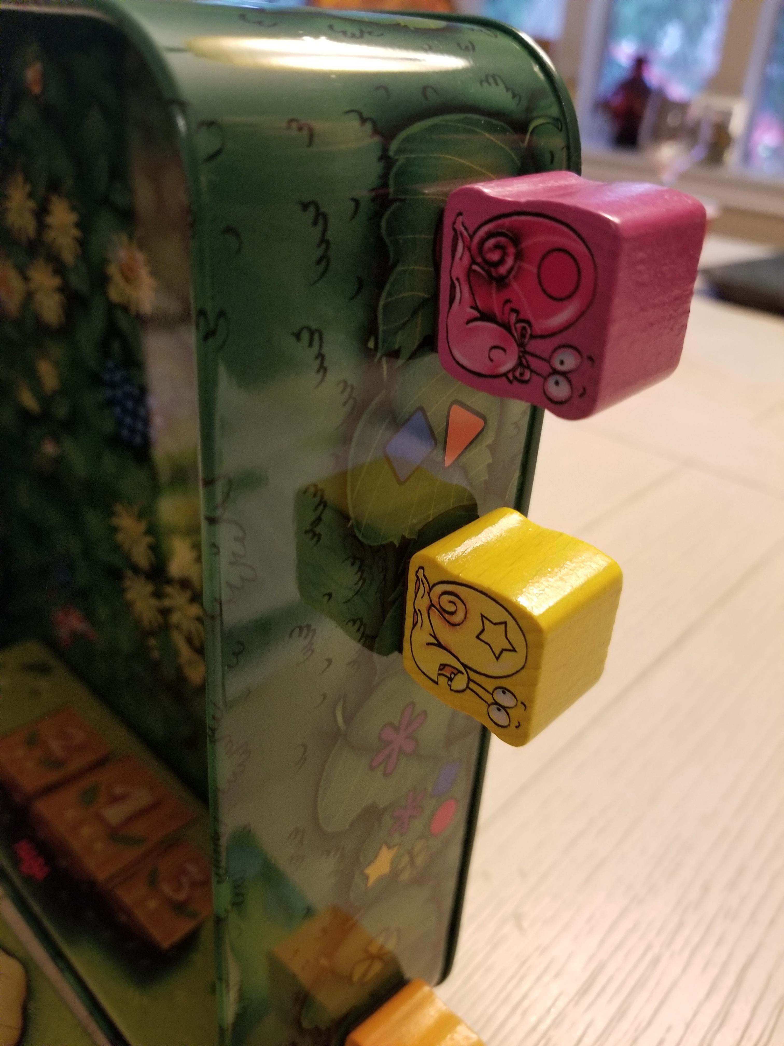 Players move snails around the table by rolling a pair of dice that have faces corresponding to each of the six snail colors. Each time they roll, the player picks one of the two colors they rolled, take the snail corresponding to that color, and move them to the next space on the track matching the other color rolled (a track space may have multiple colors). This is really the only point in the game where decisions are made - players must work to advance their snails (and only their snails), while ideally not giving up which snails are on their ticket. It's basically like betting on horses, only with snails and you can control the snail horses.