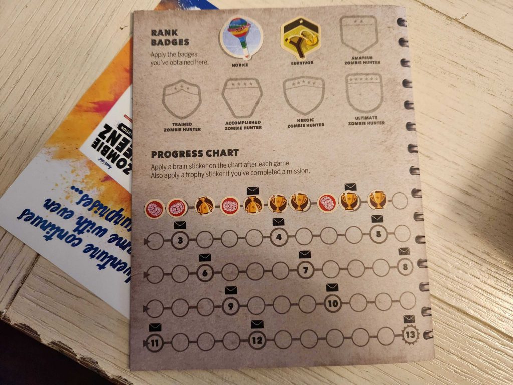 If you have younger kids, you could keep playing the game in this state until they're old enough to move on. It's simple but somewhat challenging, though adults will get bored of it after 5-6 games, most likely. But that's where the game's Legacy mechanics come in. As you play and win games, you mark those off on a score card which in turn unlocks envelopes with new rules and developments. The first of these introduces rules for specific player characters. These give special abilities to specific characters in the game, but at the cost of adding extra zombies to the board each round.