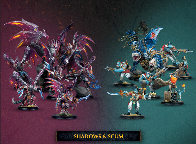 This new set, called “Shadow and Scum”, sees the release of a new cadre force for each of the factions contained within, consisting of a warcaster, character warbeast, unit, and solo. The starter box will also include a quickstart guide for games of Warmachine to streamline learning games.