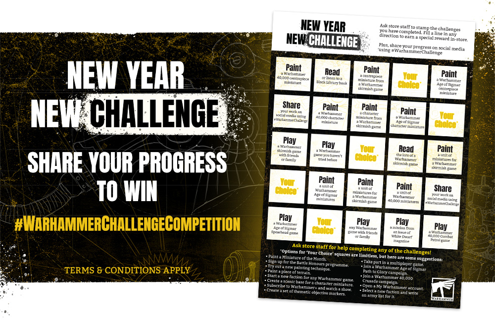 Games Workshop has gotten their new promotional campaign/social media contest for 2025 off the ground with the New Year, New Challenge hobby goal bingo card, which you can both obtain and get stamped off at your local Games Workshop store. Filling a line in any direction earns a special in-store reward, and posting your hobby progress on X or Instagram with the hashtag #WarhammerChallengeCompetition enters you into a drawing to win one of six £100 virtual gift vouchers.