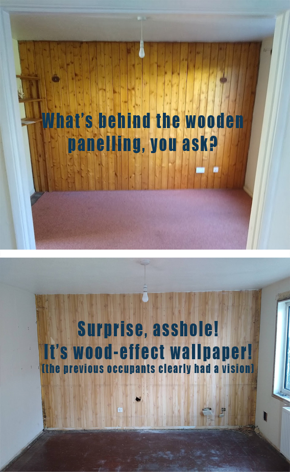My wife was thrilled to remove the wooden feature wall installed by the previous occupants. Behind it? A plaster wall covered in wood-effect wallpaper. Credit: Charlie Brassley