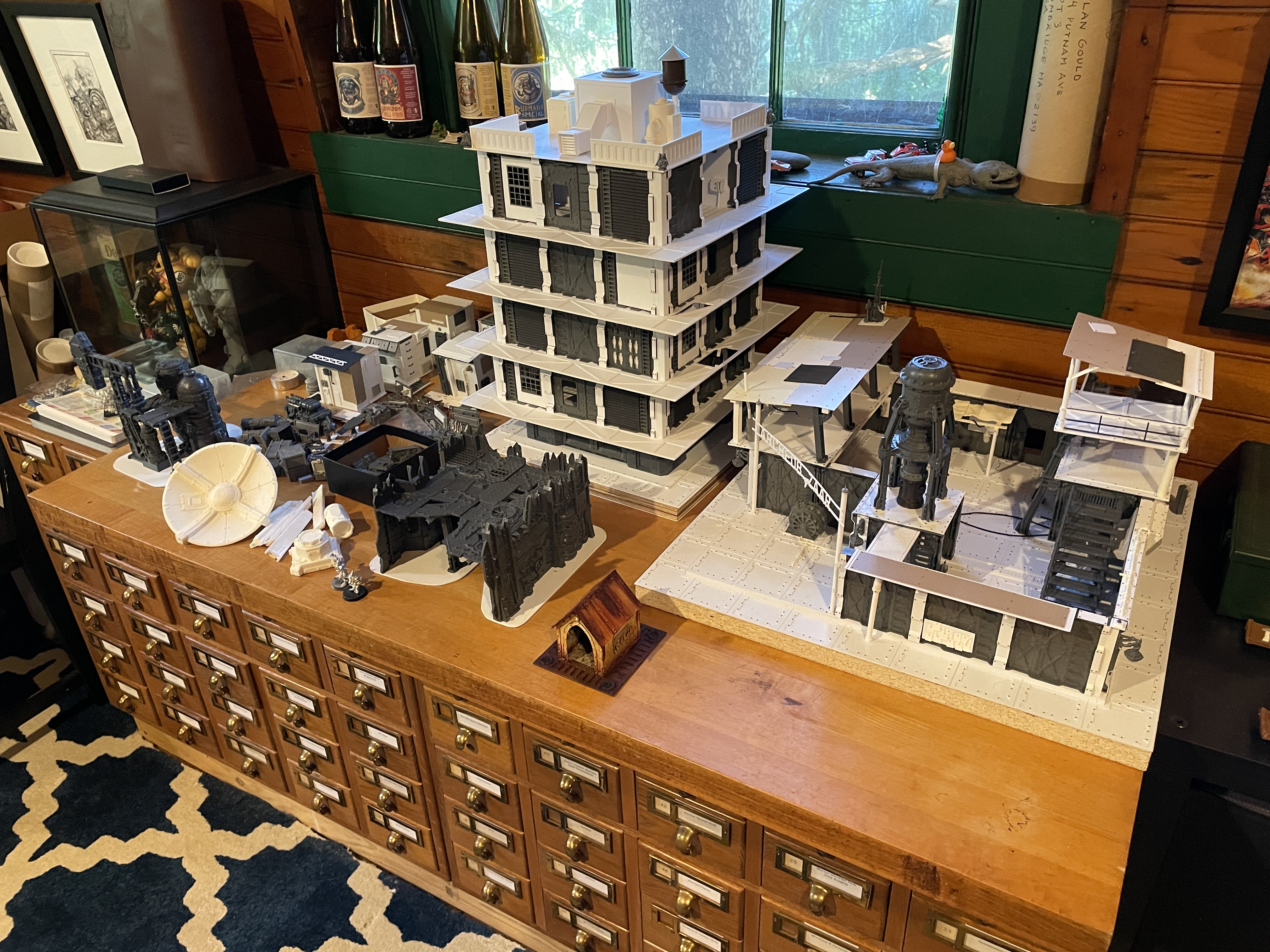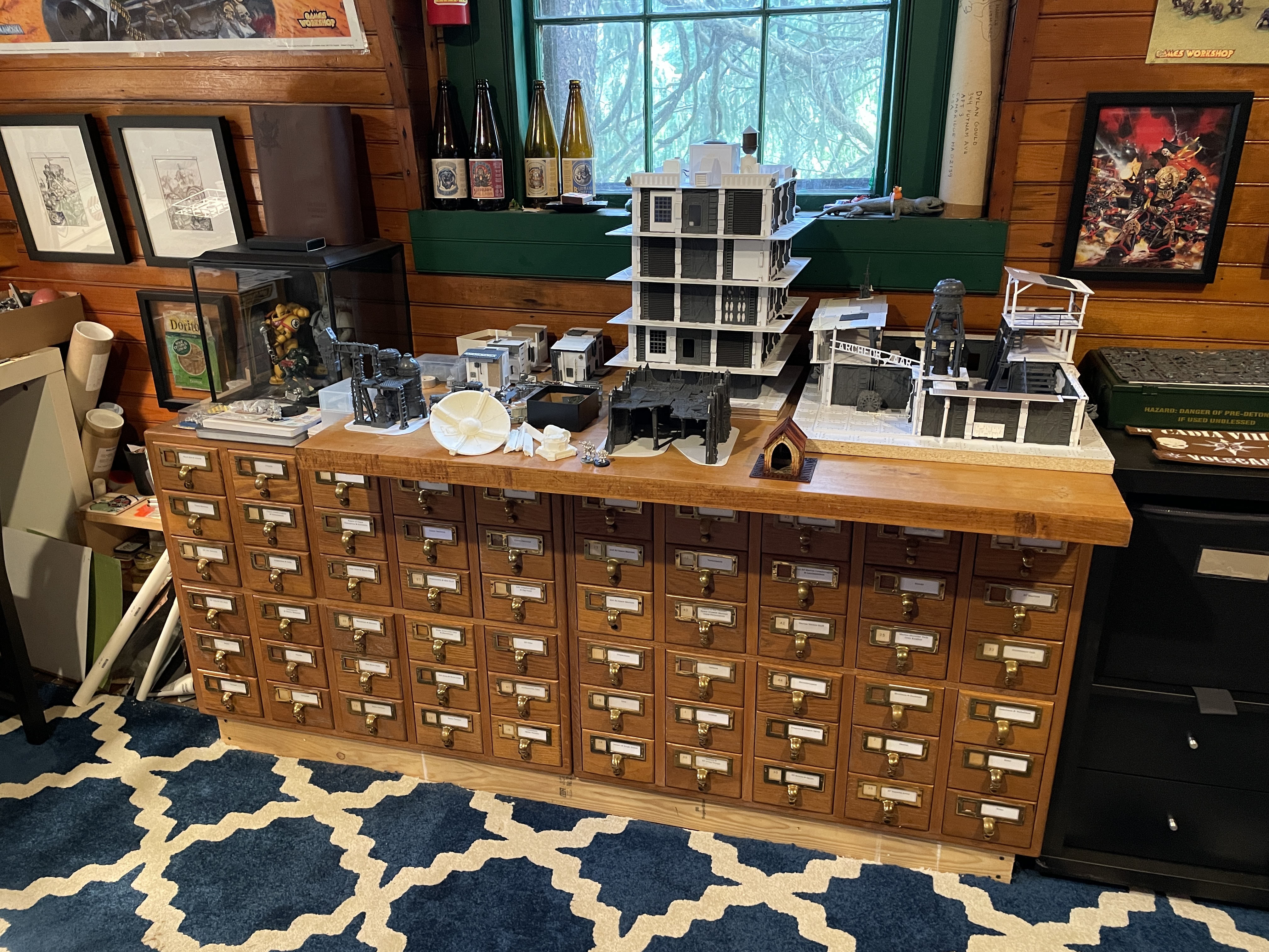 On the wall to the right sits a pair of card catalogs which were gifted to me from a friend. These contain all my loose metal miniature, which is a massive collection encompassing pretty much every sculpt that was produced for Warhammer 40k from 1988-1997. I used to have them in flat cardboard boxes, which was fine, but not very visually attractive, nor easy to find everything quickly without having to moved a bunch of stuff. Every drawer is labeled which makes finding everything very easy. On top sits an old butcher block and that's been designated for all my work in progress projects. Large terrain pieces that I'm taking a break from while I work on other stuff, minis waiting attention, etc. Also on there is a little display box that has a Bandai marine, a McFarlane Marine and one of the old Sideshow Collectable marines. Above sit the empty bottle of beer that you can get at Warhammer World, which a friend brought back from England years ago.