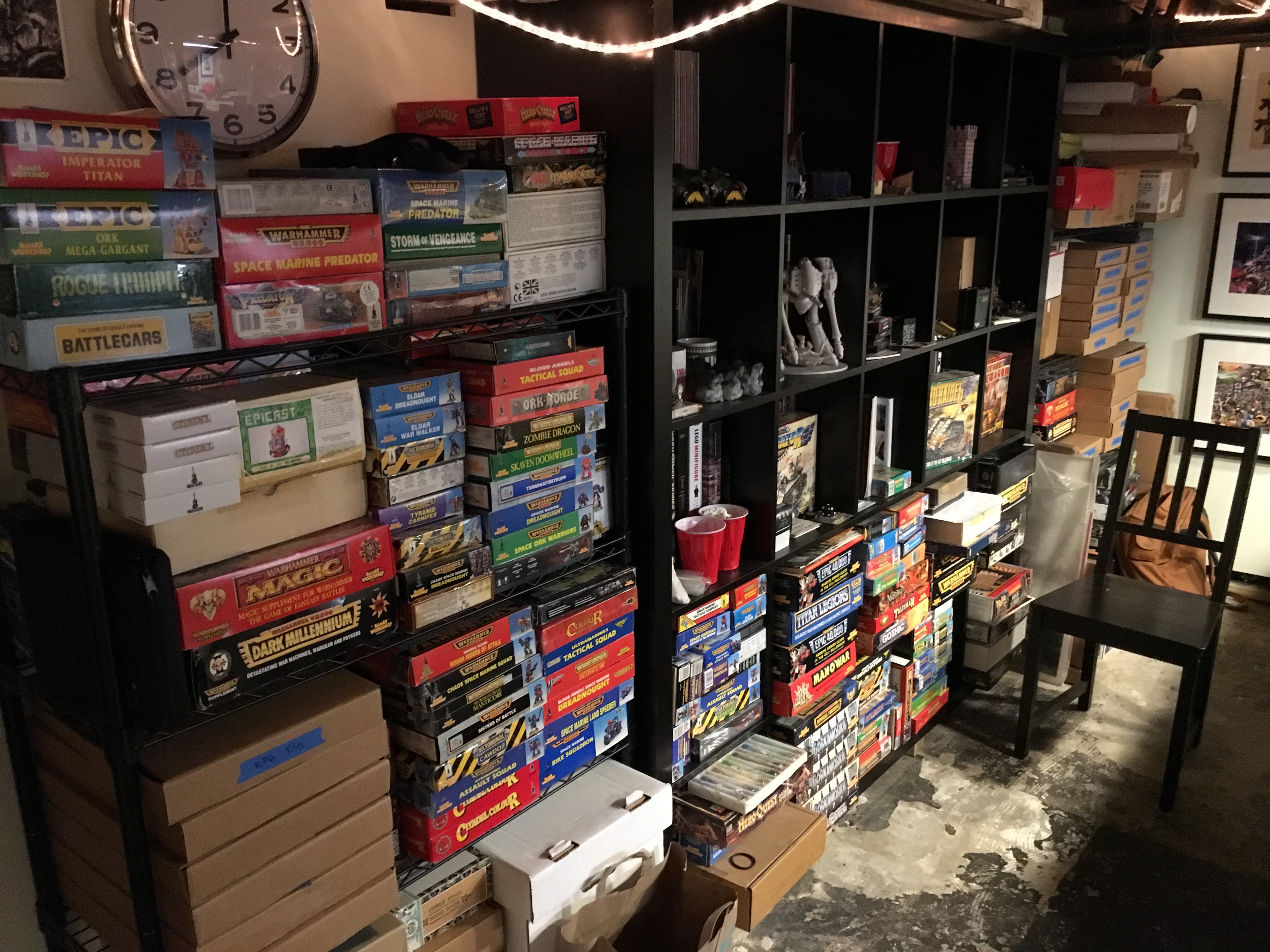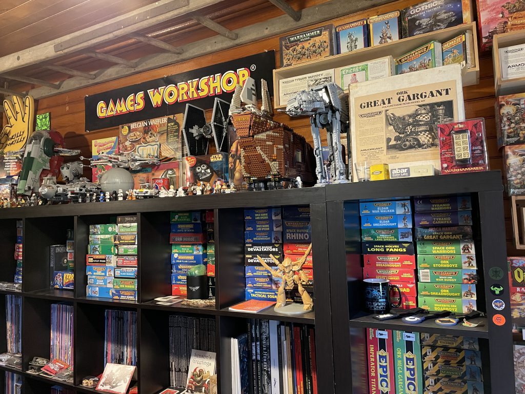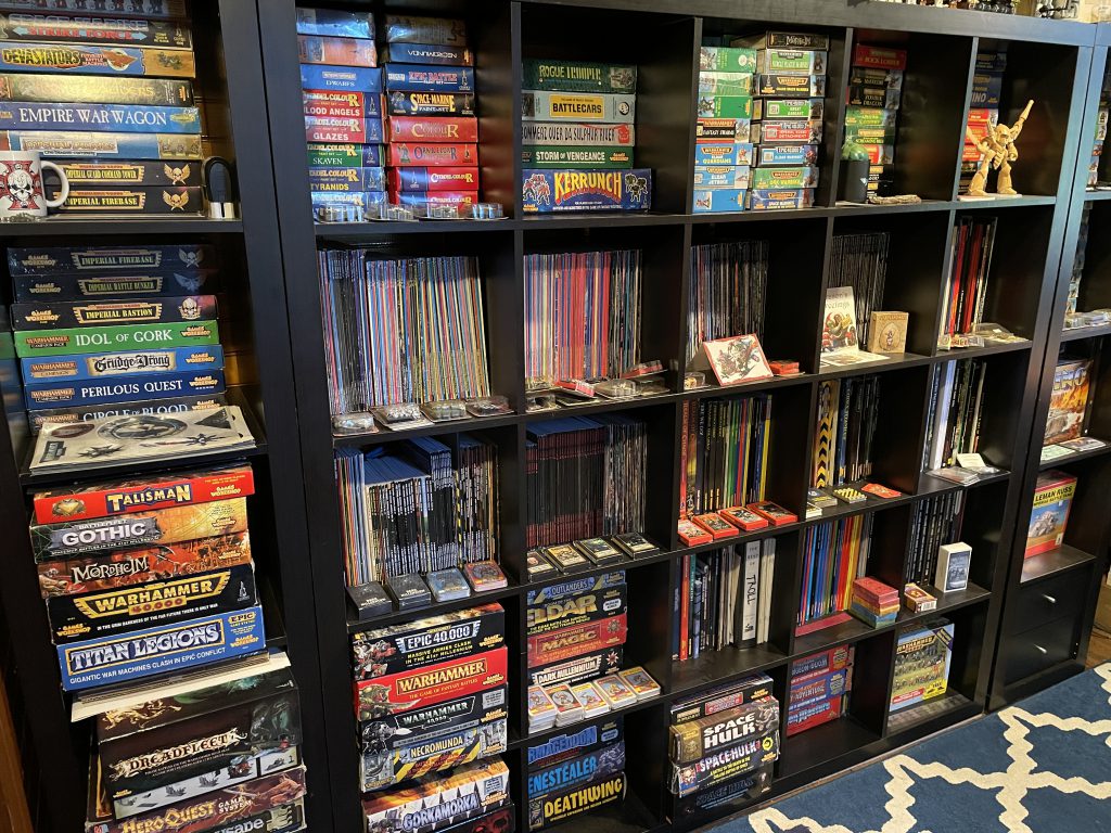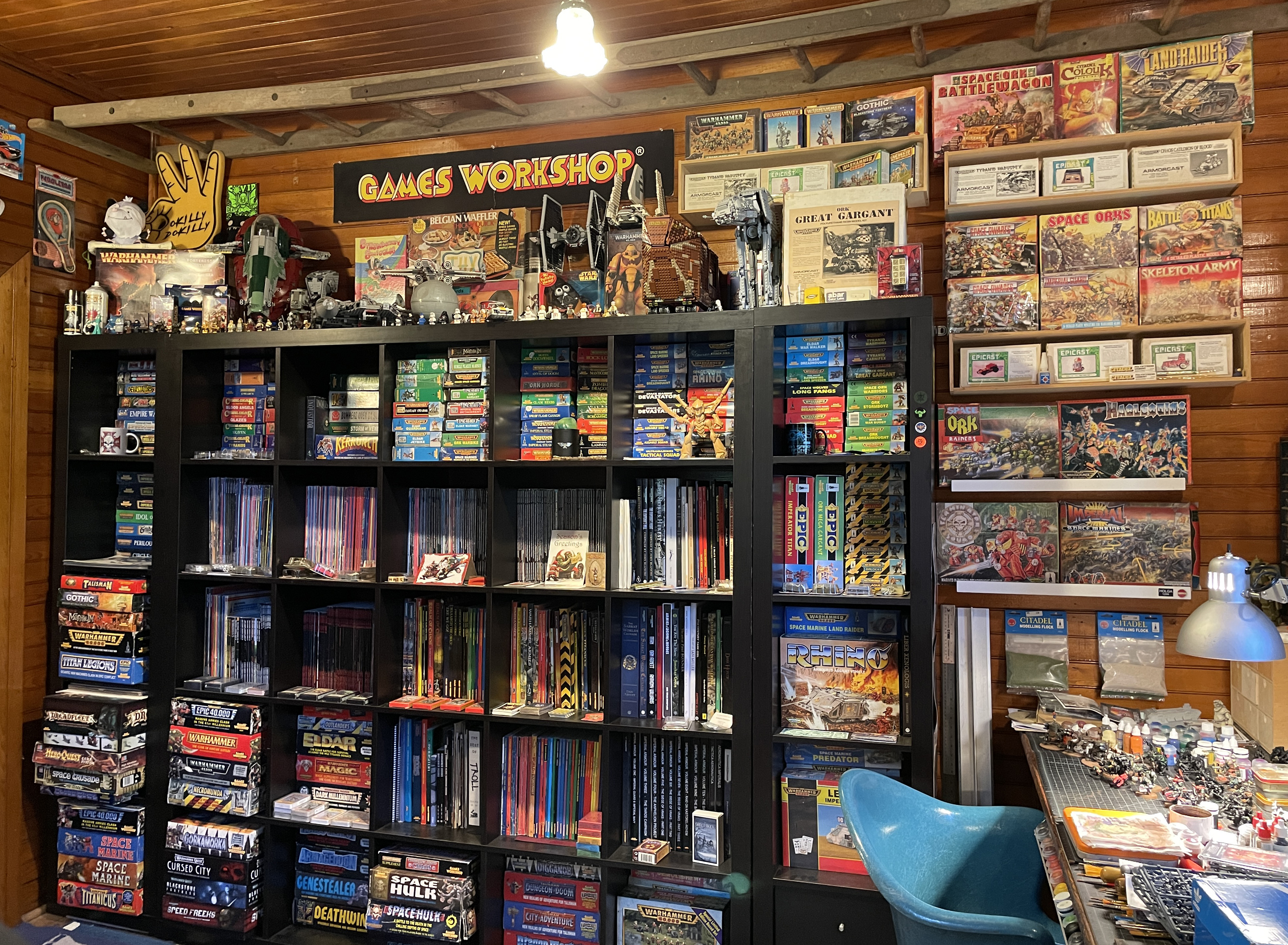 One wall is just bookcases and contains what I refer to has "The Archive". It's my collection of old White Dwarf magazines, ranging from issue 90-300+, Citadel Journal, Warhammer Monthly, Inferno, the complete range of rule books and codecii from Rogue Trader and Second Edition 40k, and various other Warhammer adjacent reference and art books. Also housed are a selection of new in box kits from the mid-90s and all my large box games. On the top is a variety of ephemera that I've collected over the years and my Lego Star Wars collection. Oh and my Armorcast Great Gargant.