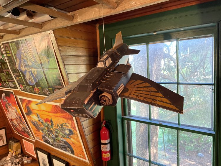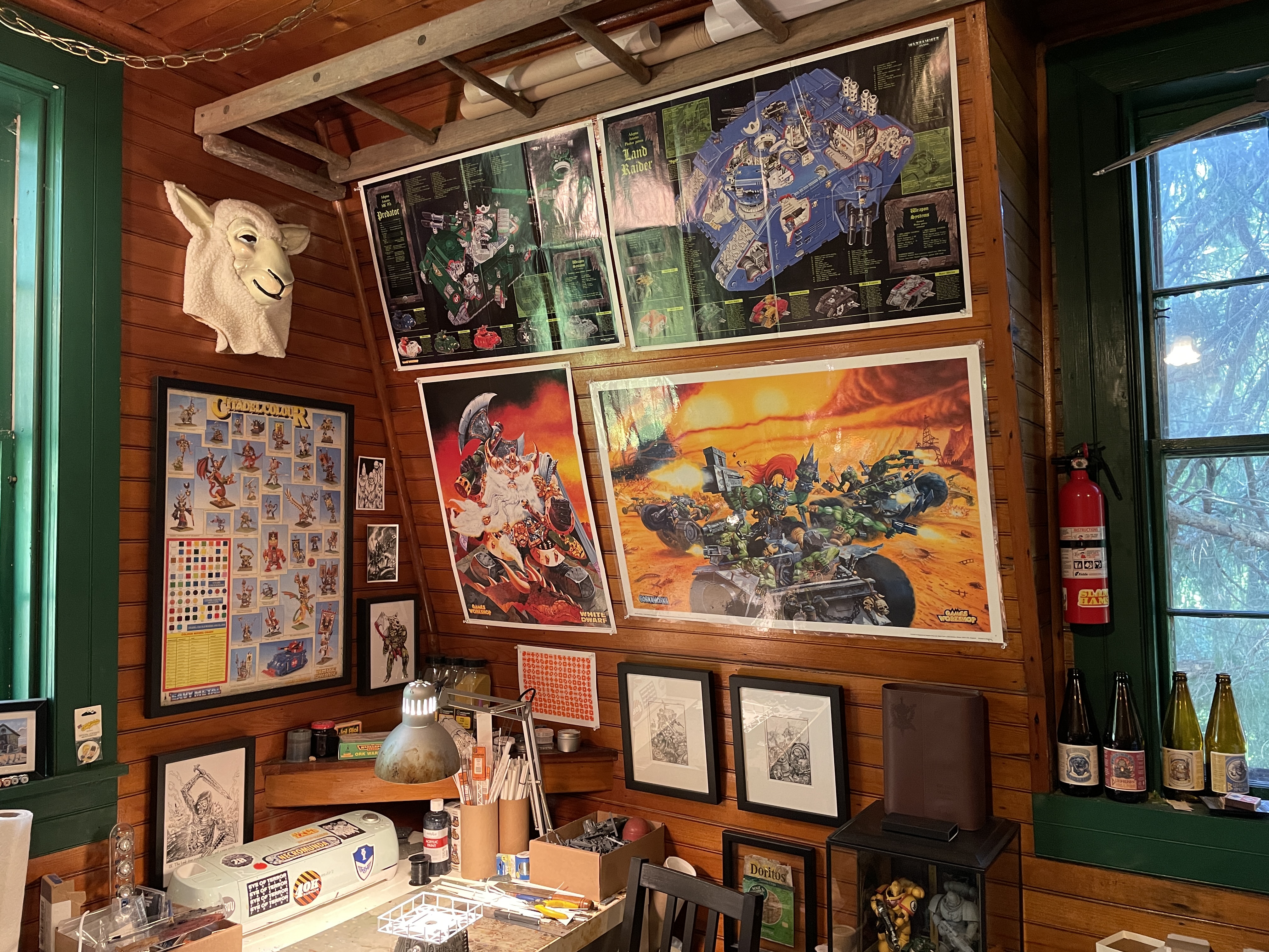 The walls hold some very old and very cool posters, some of which I've had framed, prints from Nerdgore, and with a few pieces of original GW art from Tony Hough. I have a small collection old GW mugs (there's a couple out there that I'd still love to get, hot wheels and loads of other stuff. I even had a friend hook me up with the cardboard Thunderbolt. The sheepshead mask is from a TV commercial that was shot at the last advertising agency I worked at.