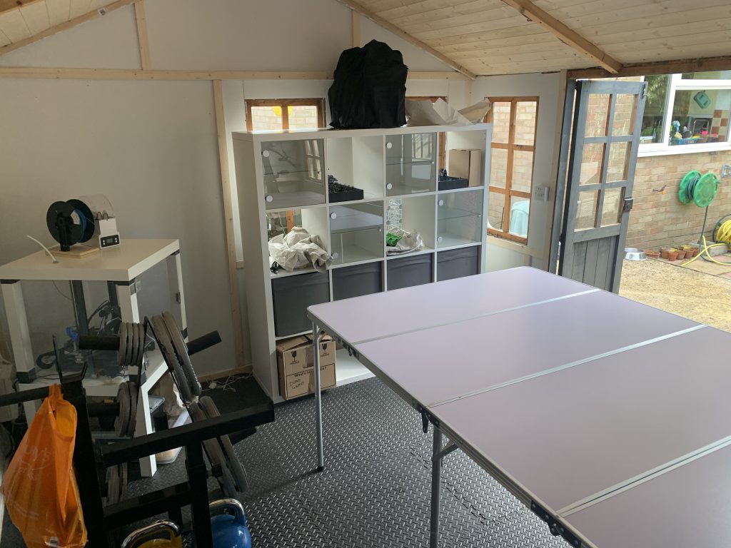 I already owned a 6' x 4' foldaway table from Urbanmatz and a 4 x 4 Ikea Kallax from my previous hobby space. The Kallax plus a couple of garage storage boxes allowed me to set up a nice display for my miniatures and tidy away all of my terrain in a fairly compact way. My squat rack and weight bench can be packed away to be relatively compact and the room is just large to accommodate the table and a couple of people.