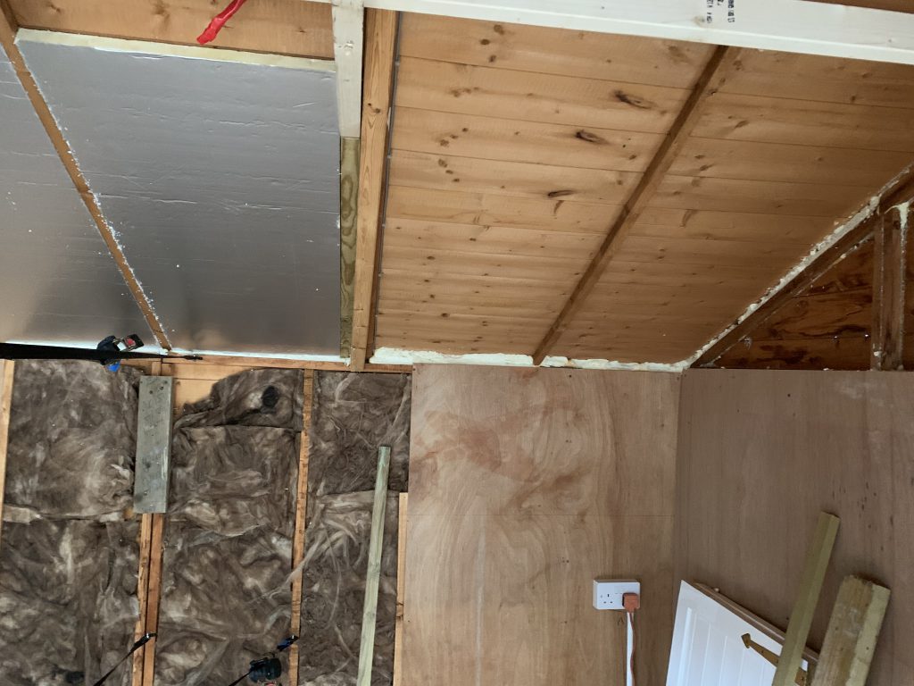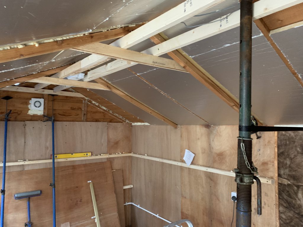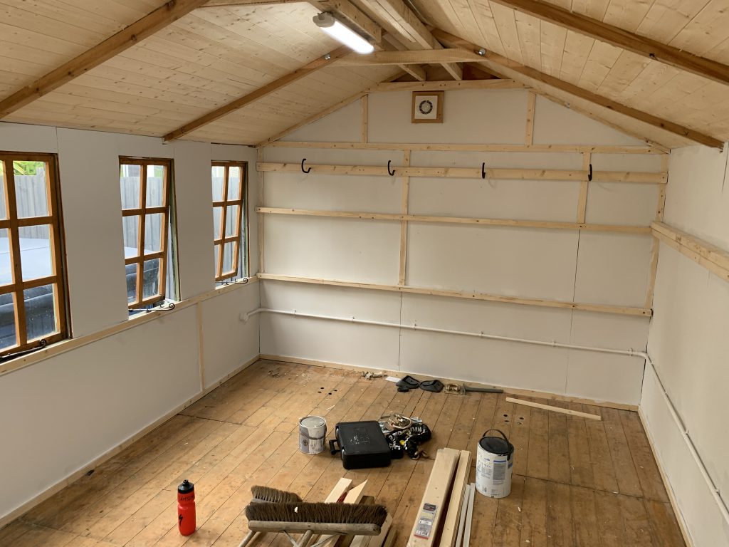With the building cleared the old floor could come up and the real work could begin. There was significant sag in two of the walls and the ridge line of the roof so after jacking everything up and using cargo straps to pull it plumb, CLS timber was added to reinforce each wall. After the walls were fixed up they were re-paneled with 6mm interior plywood and the ceiling was insulated with Kingspan foam and then covered with softwood tongue and groove boards to give a slightly nicer finish. With the structural work done a pair of high wattage LED lights replaced the slightly sad security lights, making the room even brighter and more comfortable for long hours of gaming. Things were getting exciting at this point, with the promise of my own hobby space only a few days away.