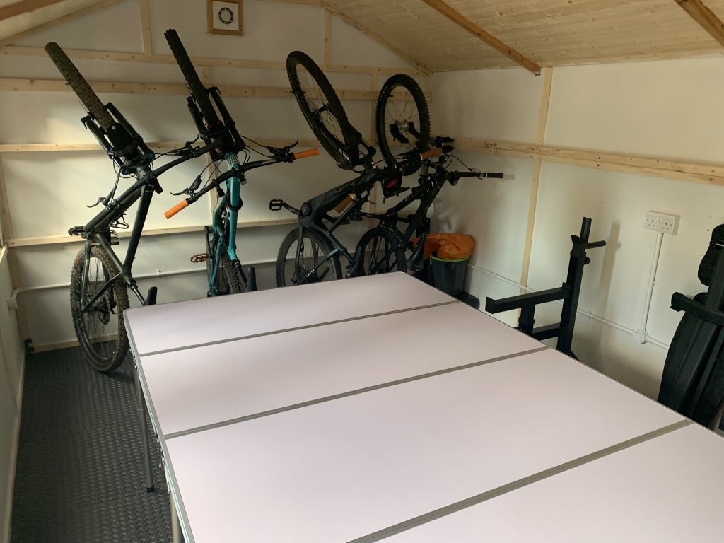I’m still debating whether I’ll stain the exposed wood, but I sanded back the plywood boards and painted them cotton white to brighten the room up a little. I also laid new black expanded foam matting and fitted a couple of heavy weight ground anchors for the bikes.