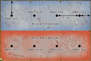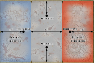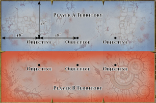 Another new battleplan with 6 objectives. Each turn the opposing player picks one objective in their territory to be the Primary objective for the turn. This is worth 3 victory points, all others are worth 1.