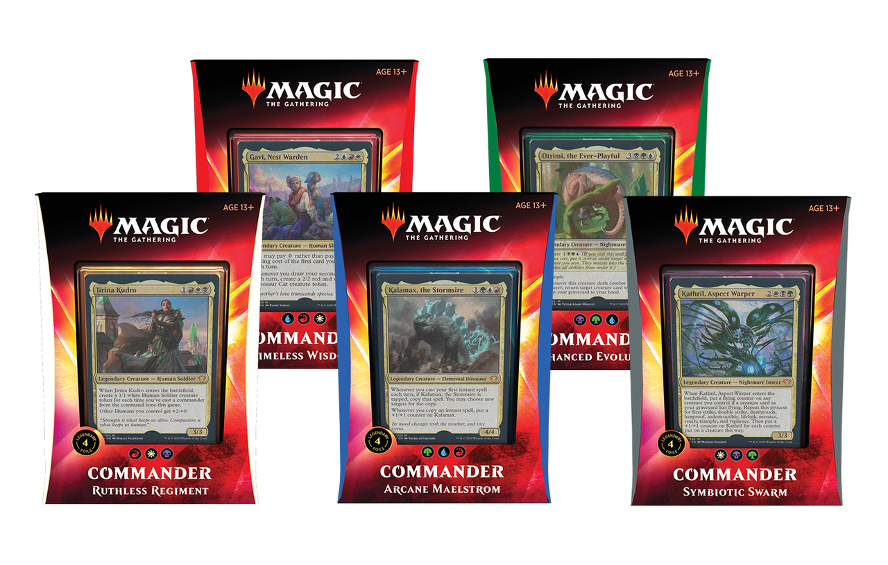 Each year Wizards of the Coast releases a “Commander XXXX” set, which consists of four to five 100-card preconstructed Commander-legal decks. Each deck features 3 Legendary 'face' creatures as a regular and oversized card (both in foil) to choose between as your Commander, and each deck is organized around a theme. These decks are a really good way to get started in Commander, and unless you have a lot of experience in Magic and an extensive collection, are by far the simplest way to get started. In addition to automatically meeting the requirements of Commander in terms of color identity, these decks will also have appropriate mana bases. Putting together the various flavors of dual lands to optimize your mana base for a Commander deck can be difficult (and expensive) as many of the best dual and tri-color lands are from sets long in the past, while starting with one of these decks gives you a set of lands designed to allow you to have all the colors needed to play the cards in the deck. The decks also contain core cards that usable in any deck, such as