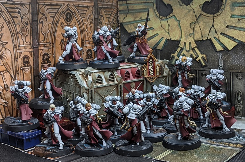 To build this list you will need the Combat Patrol box, a Palatine, one Battle Sister Squad, 2 boxes of Celestian Sacrestants, and one Repentia Squad.